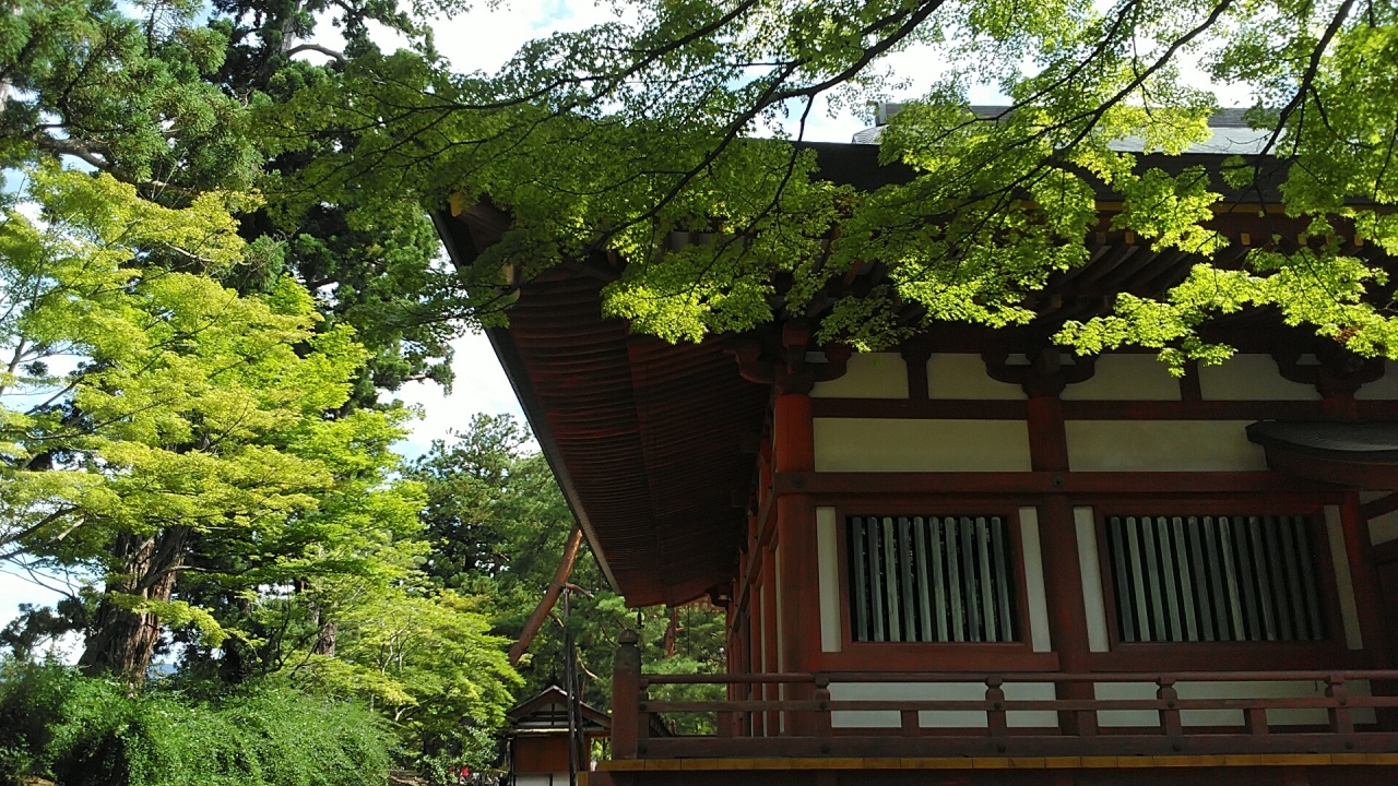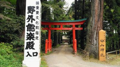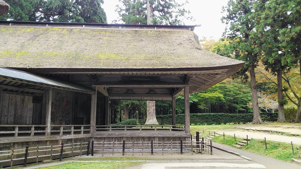 中尊寺鎮守の白山神社境内にある能楽殿は規模も大きく歴史を感じる建物です。能楽殿は嘉永六年(1853)伊達藩によって再建されたもので、正統かつ本格的な規模と形式の能舞台で平成15年にに国の重要文化財に指定されました。現在は毎年5月4日5日に古実式三番と神事能が中尊寺一山の僧侶によって神前に奉納されています。金色堂からもちかく、境内は緑も多く癒されます。