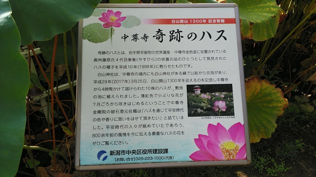 新潟総鎮守白山神社で歴史も古く境内も広く、歴史ある建物も多く気持ちよくお詣りできる神社です。本殿前の松は海が近く、風向きに流された松が素晴らしく本殿と荘厳な景観を作ってます。境内には平泉の中尊寺からおくられた奇跡のハスが9月5日に咲いていて癒されました。白山神社と白山公園は新潟市の代表的な美しい風景だと思います。
