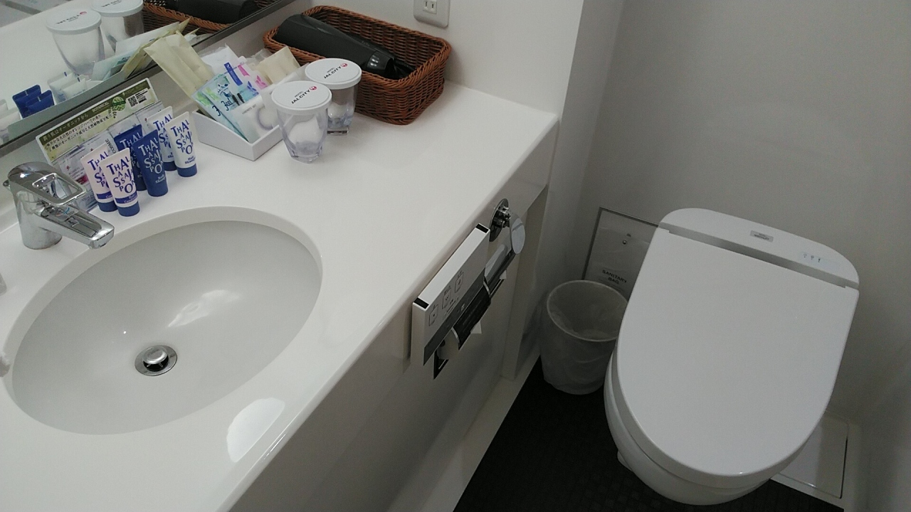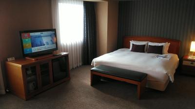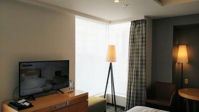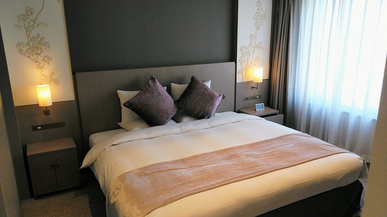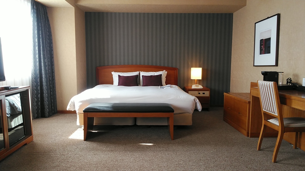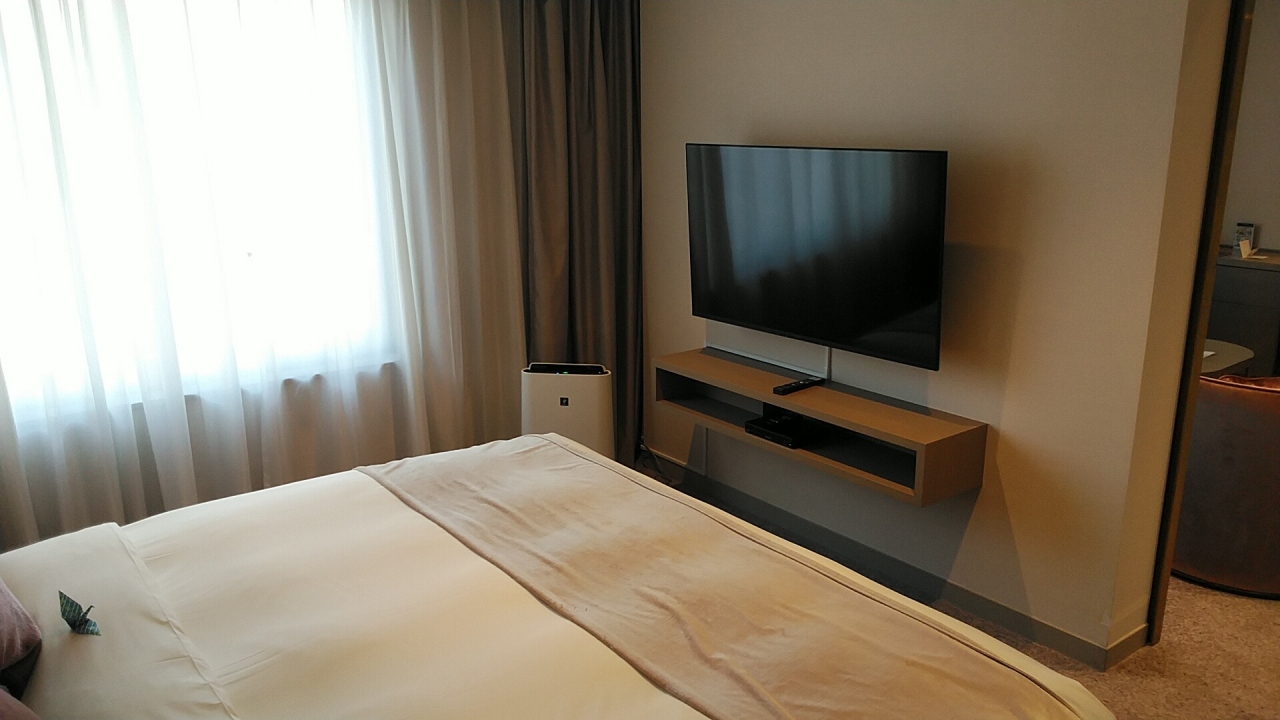 部屋は30㎡で180cmのキングベッドのデュベスタイルに加湿空気清浄機、ソファーにテーブル、角部屋で窓が2方向あって明るく室内扉もあって静で良かったですね!水回りは少し古さを感じましたが広めで部屋と同様に出窓があり浴槽、独立のシャワーブース、洗面台、トイレとなっていて明るく出窓に物が置けるので便利でした。