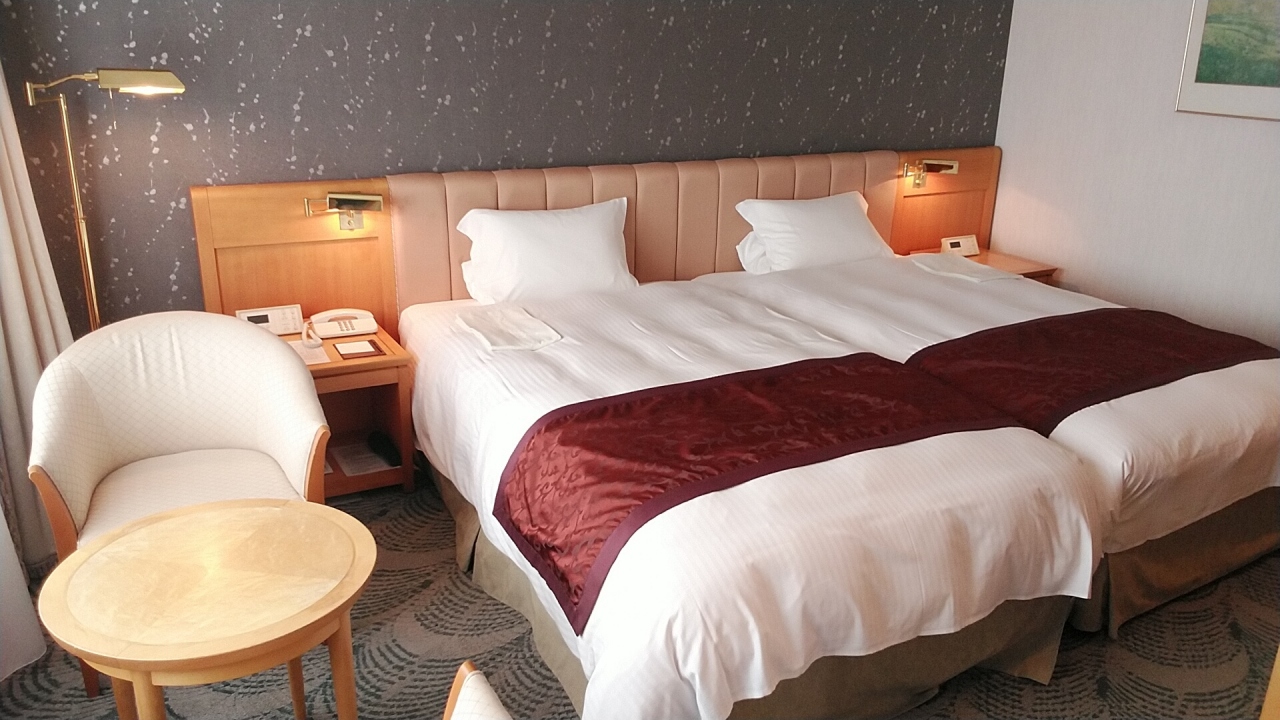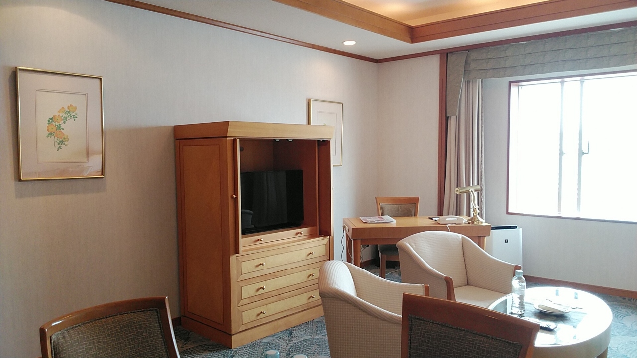 今回はどこかの国の大臣が宿泊したスイート70㎡に宿泊しました。部屋は廊下の一番奥にあり静で、入口付近にクラッシックなデザインのリビングルーム、奥にハリウッドツインのベッドルーム、ツーボールの洗面室とトイレ、お風呂があり快適に過ごせました。お風呂はミラブルシャワーヘッドにタルゴのミニボトルのシャンプー類にバスローブ等、飲み物はコーヒーマシーンに、緑茶、ほうじ茶、ミネラルウォーターもふんだんにあり良かったですね。