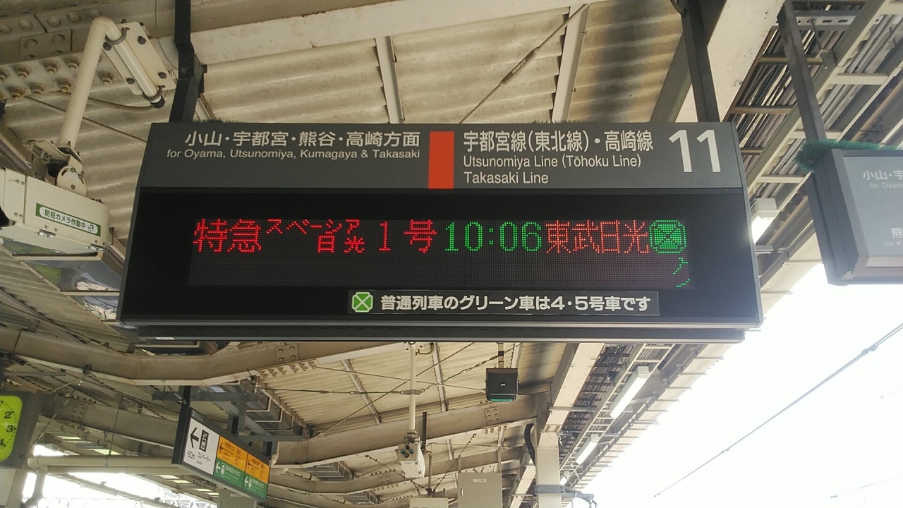 新宿駅発~池袋駅~浦和駅~大宮駅の順番にとまって、栃木駅、新鹿沼駅、下今市駅、東武日光駅にとまるJRから東武線経由のスペーシアが1日1本あります。本数が少ないのとJRと東武線のW運賃で少し高めで比較的空いていて個人的には良いですね!座席も広くゆったりしてるので大宮から東武日光まで84分快適に過ごせます。車窓も栃木県に入ると今の時期田んぼに山並みが綺麗です。