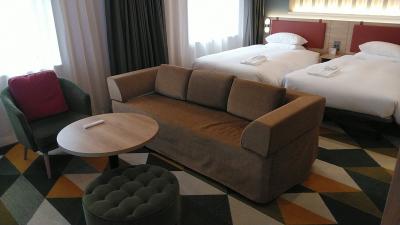 部屋は45㎡あるのでゆとりがありツインのデュベスタイルのベッドメイキングに、テーブルにソファー、ビューバスでゆっくりできます。レストラン、ラウンジ、ケーキのテイクアウト等も再開されているので館内で楽しめます。朝食はビュッフェで美味しく、オムレツはオーダーで提供され、デザートの苺のソフトクリームがソルベ風で美味しかったですね!館内レストランはテイクアウトもあって以前と比べ選択肢も増えてました。駐車場は無料で、スタッフも親切で心地よい滞在でした。- 旅行時期