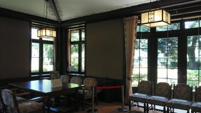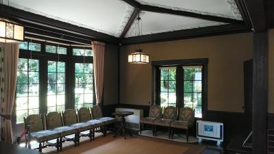 渋沢栄一公の77歳の喜寿のお祝いに元清水建設からプレゼントされた洋風茶室です。建物はコンパクトですが天井の装飾が素敵で、外部は森に囲まれていて避暑地の別荘のようです。内装は素敵な照明に暖炉もいいですね!渋沢史料館、青淵文庫、晩香廬3館で300円で見学できます。