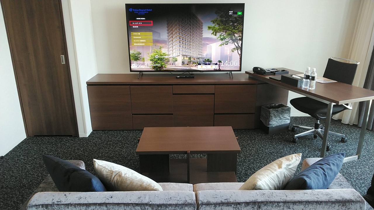 ラージツインは上層階に位置していて最上階13階にアサインされました。部屋は35㎡でちょうど良く大きな窓、ソファーに食事も可能なテーブルもあり、ベッドメイキングはデュベスタイルに加湿空気清浄機、ミネラルウォーターにドリップコーヒー、紅茶2種類に緑茶等、バスアメニティはポーラのミニボトルのシャンプー類にボディークリーム、梅の香りの入浴剤、バスローブ等で快適に過ごせました。