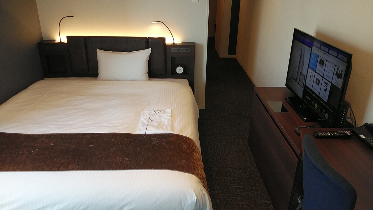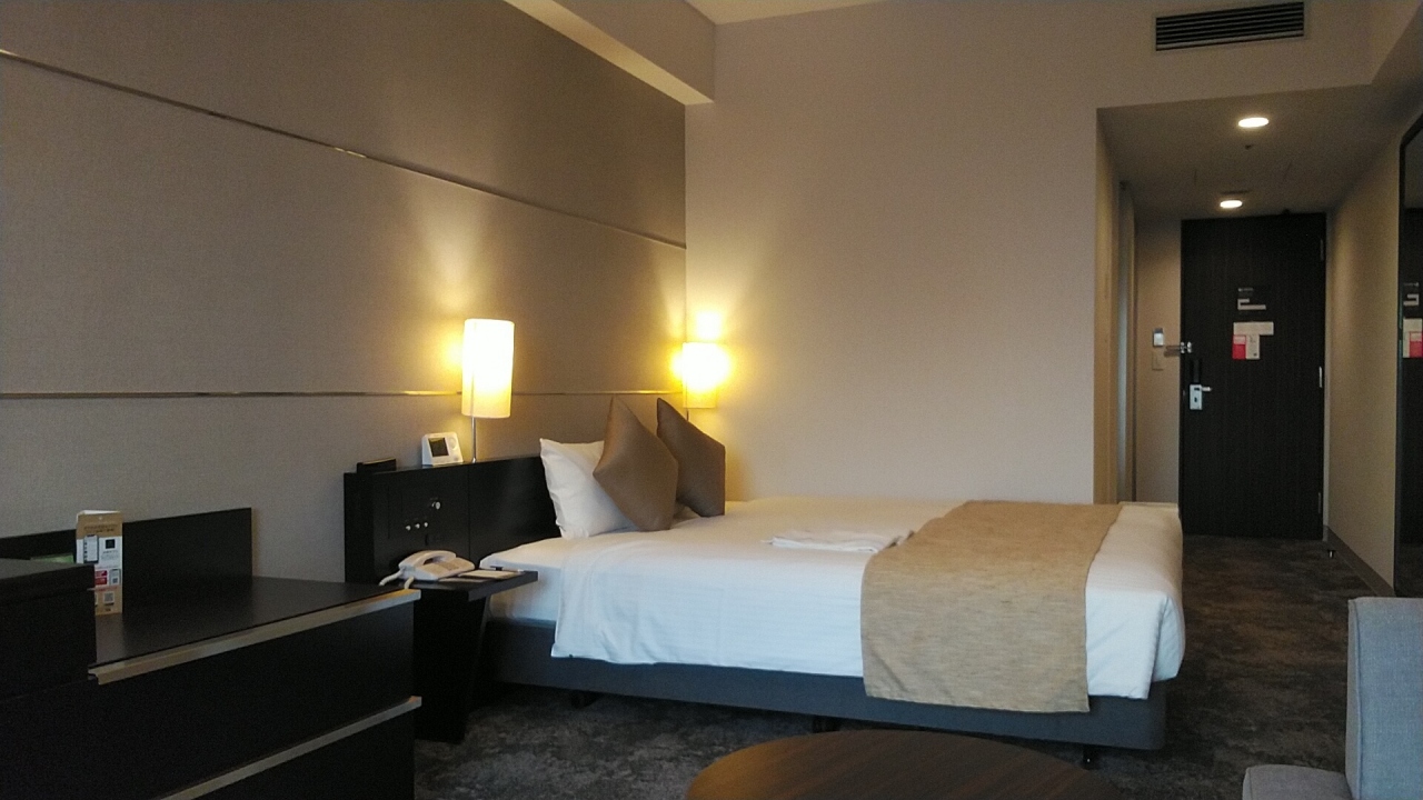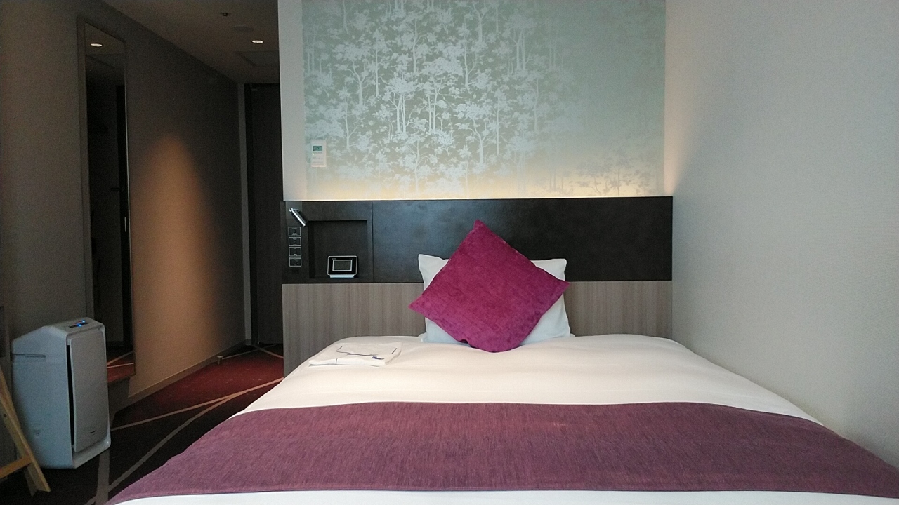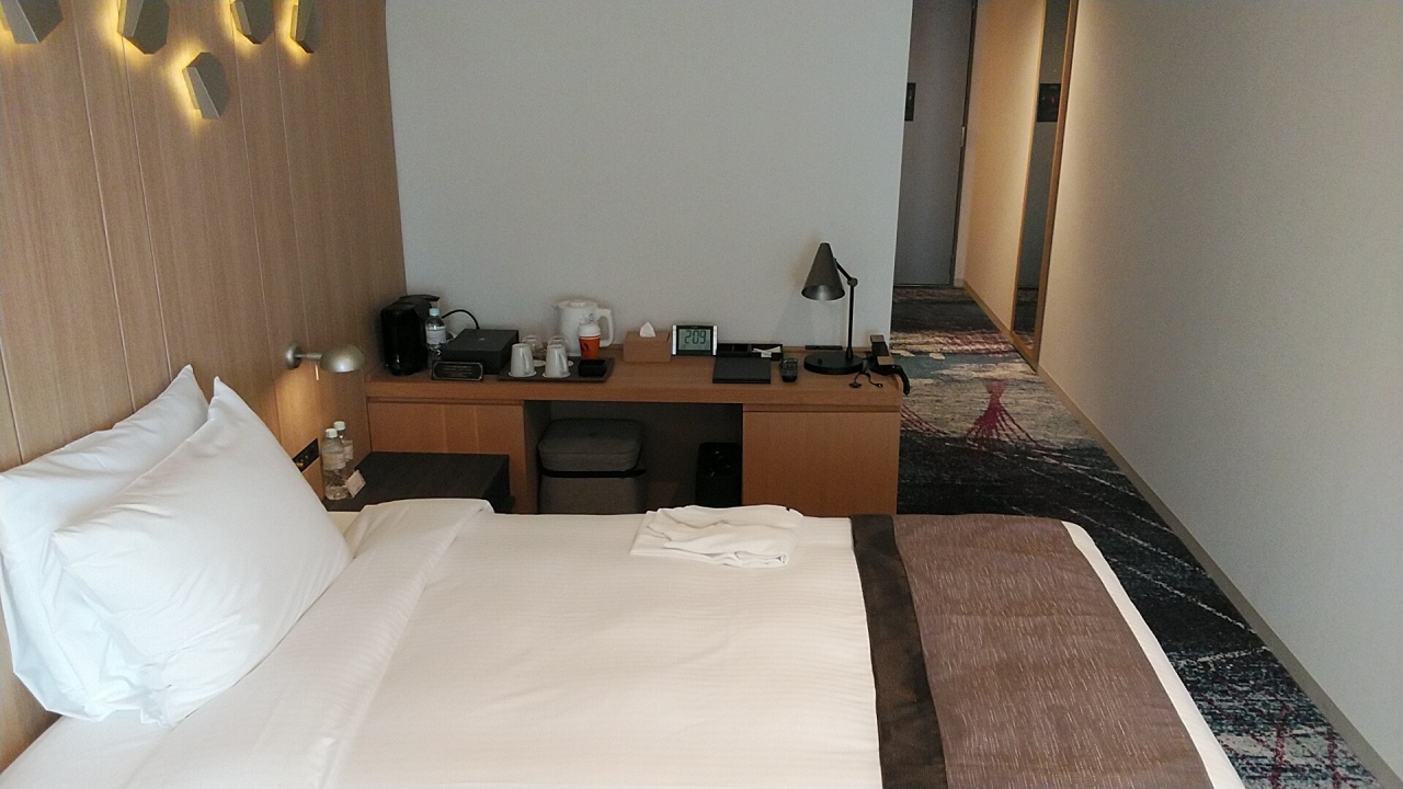 ホテル内で一番広いデラックスダブルに2泊しました。部屋は一番奥にあって窓も2カ所あって静かで良いですね!ベッドは168cm幅のデュベスタイルのベッドメイキングにマッサージチェア、加湿空気清浄機、窓も少し開くので換気もとれて快適でした。お風呂独立でレインシャワー、洗面台とトイレは同室ですが便利です。部屋の表示面積は29㎡ですが、水回りに廊下のスペースが多く表示面積ほど広くは感じませんでした。一人だったので快適でしたがマッサージチェア以外にイスは1脚しかないので2人だと少し不便そうですね!