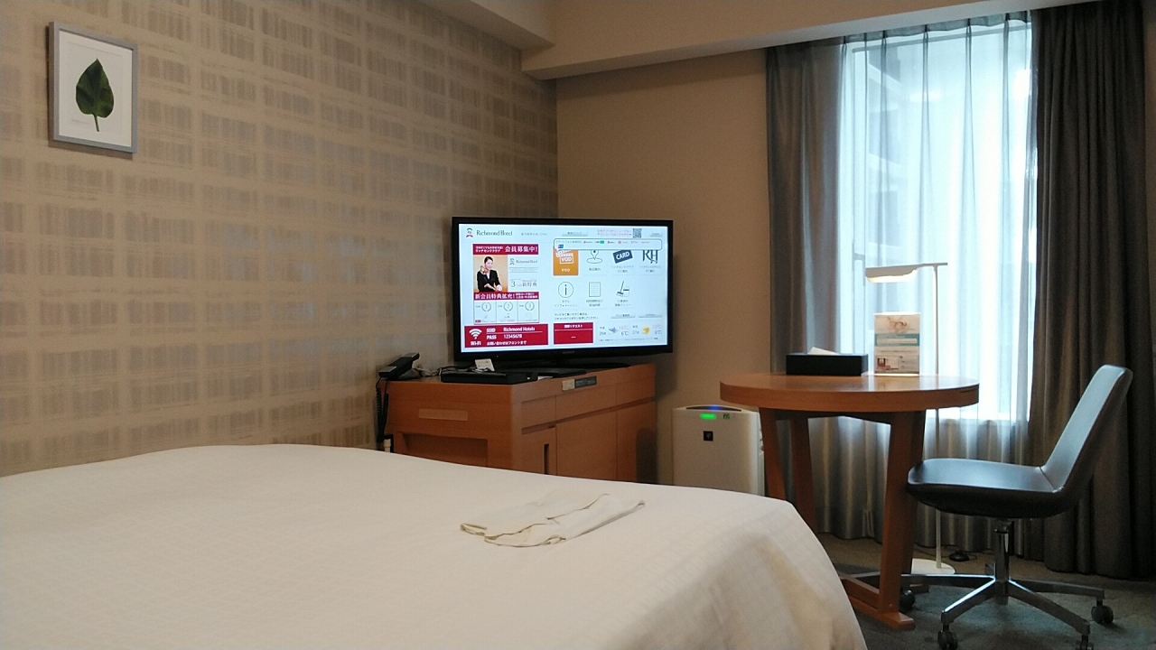 土曜日宿泊でしたが会員枠でリーズナブルに宿泊できました。部屋は18㎡でデュベスタイルのベッドメイキングのベッドに加湿空気清浄機、大きめなテーブルでゆっくりできました。アメニティはフロント階でもらえて入浴剤があるのがいいですね。部屋にドリップコーヒーと緑茶はあります。眺望は駅前で道路を挟んでマンションがあるので最上階10階でもあまり望めませんが、窓際からは左右に福島の山並みが見えました。一人だと広さもちょうど良く快適でした。接客も安定のリッチモンドホテルで良いですね!