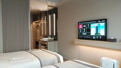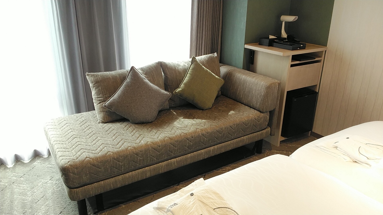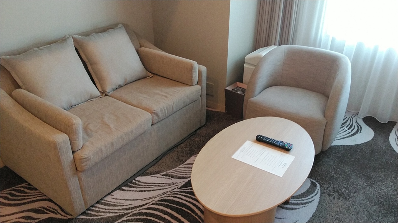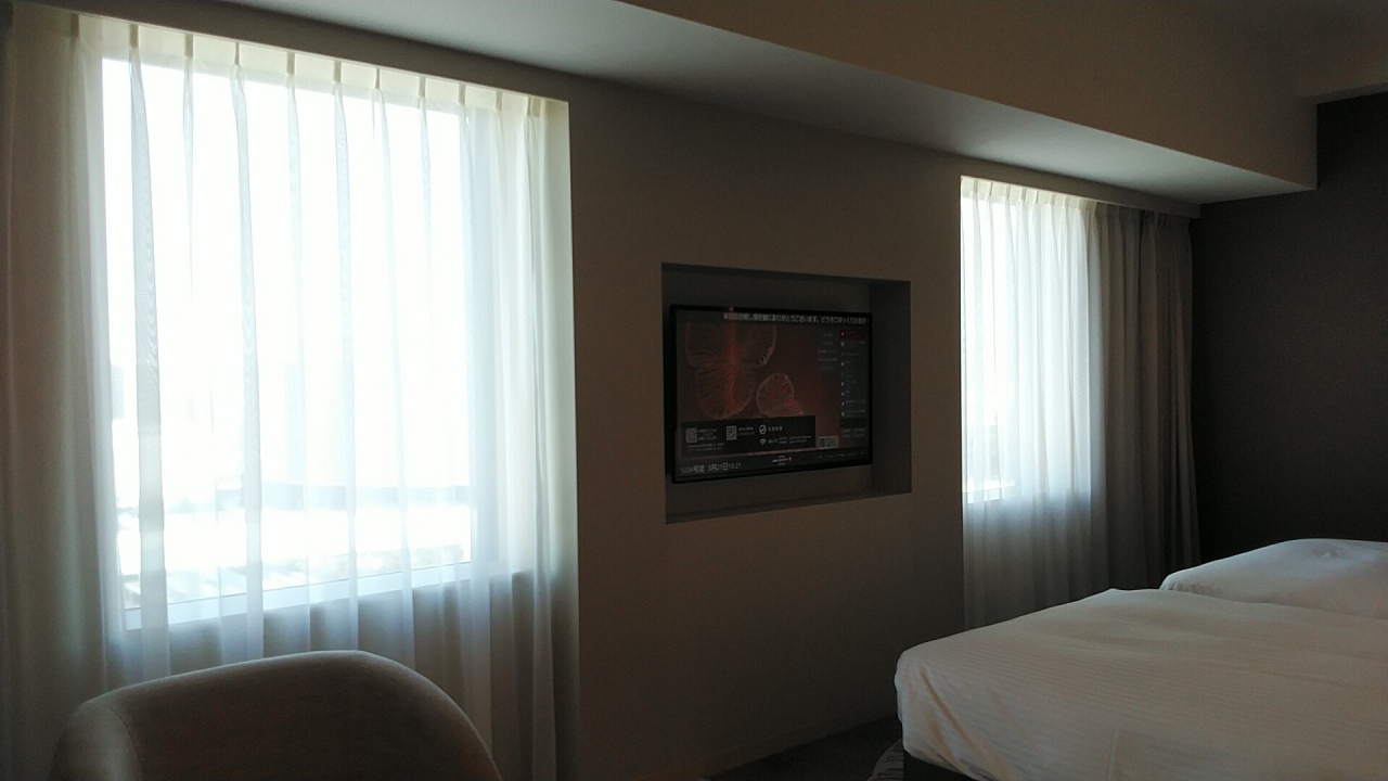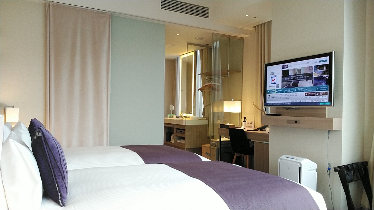 今回は2タイプあるデラックスツインのコーナー側で無い部屋に宿泊しました。眺望は豊洲駅方向に窓が2カ所あるのでリビングエリアとベッドからも運河にタワーマンション群の都心の眺望が楽しめます。ベッドは120cm幅のハリウッドツインのデュベスタイルのベッドメイキングに加湿空気清浄機、トイレ独立、浴室独立で快適でした。2人用と1人用のソファーに大きめなテーブルで部屋のみには便利でした。内装の設えに落ち着きあるカラーリングでお気に入りホテルでゆっくりできました。