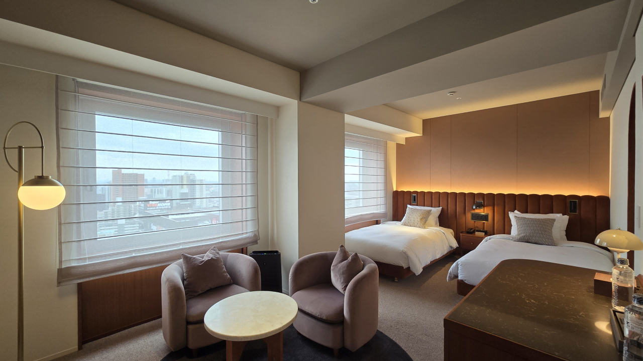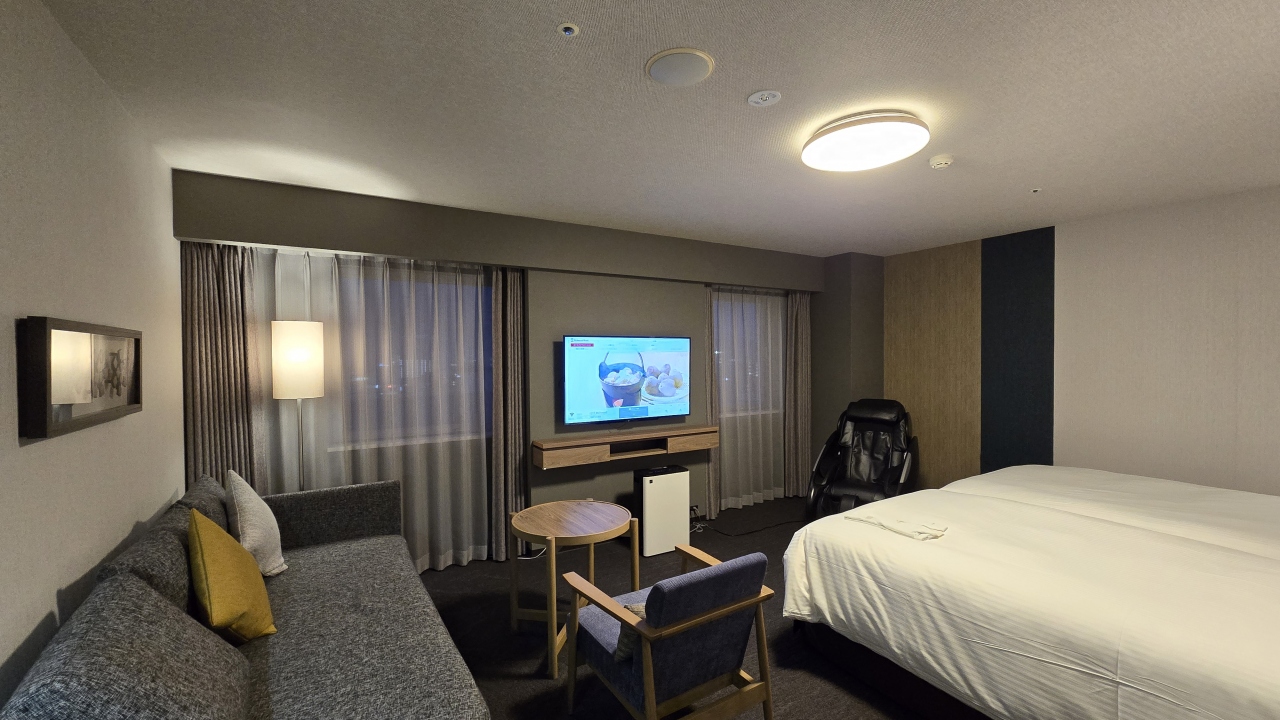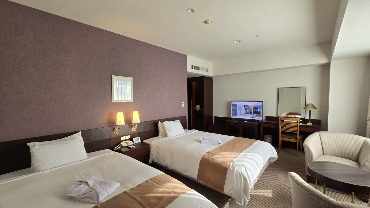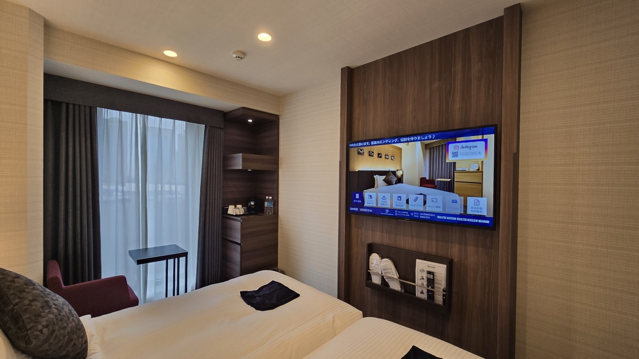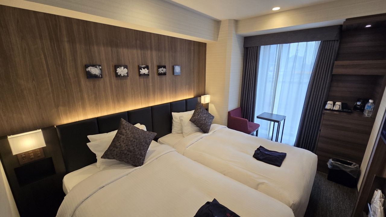 2024年4月に9〜11階がリニューアルされ今回はニュースタンダードフロアのツインルーム11階にアサインされました、部屋はシモンズのデュベスタイルのベッドメイキングに、壁掛けのテレビ(角度が動きます)、加湿空気清浄機で、家具のレイアウトは窓側にソファーにテーブル、机、冷蔵庫等と使いやすくスッキリしていて良かったです