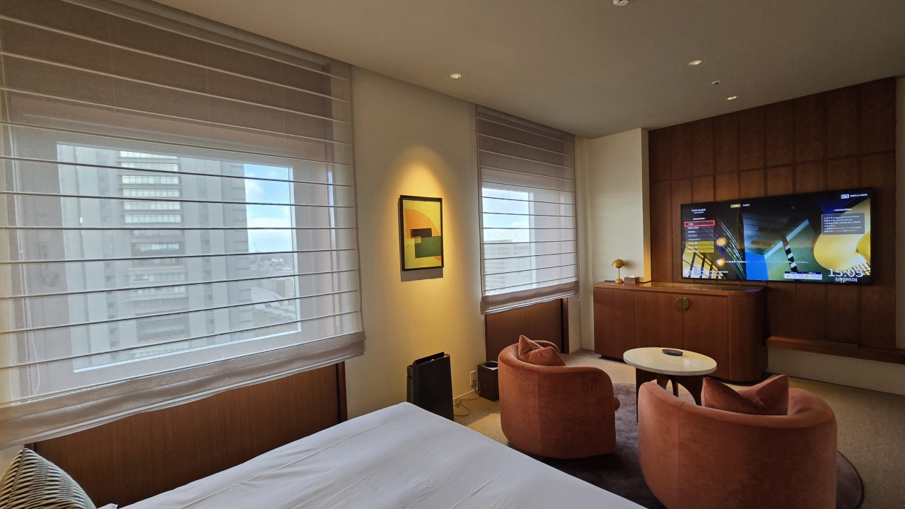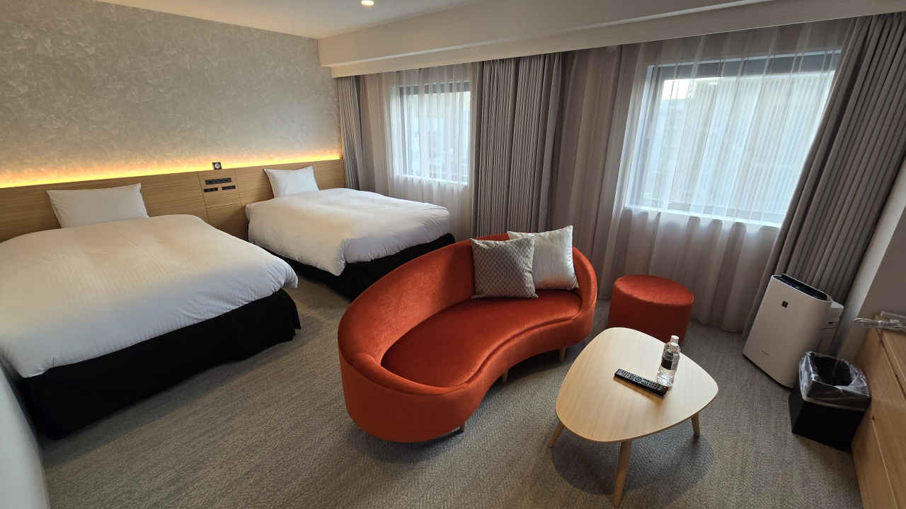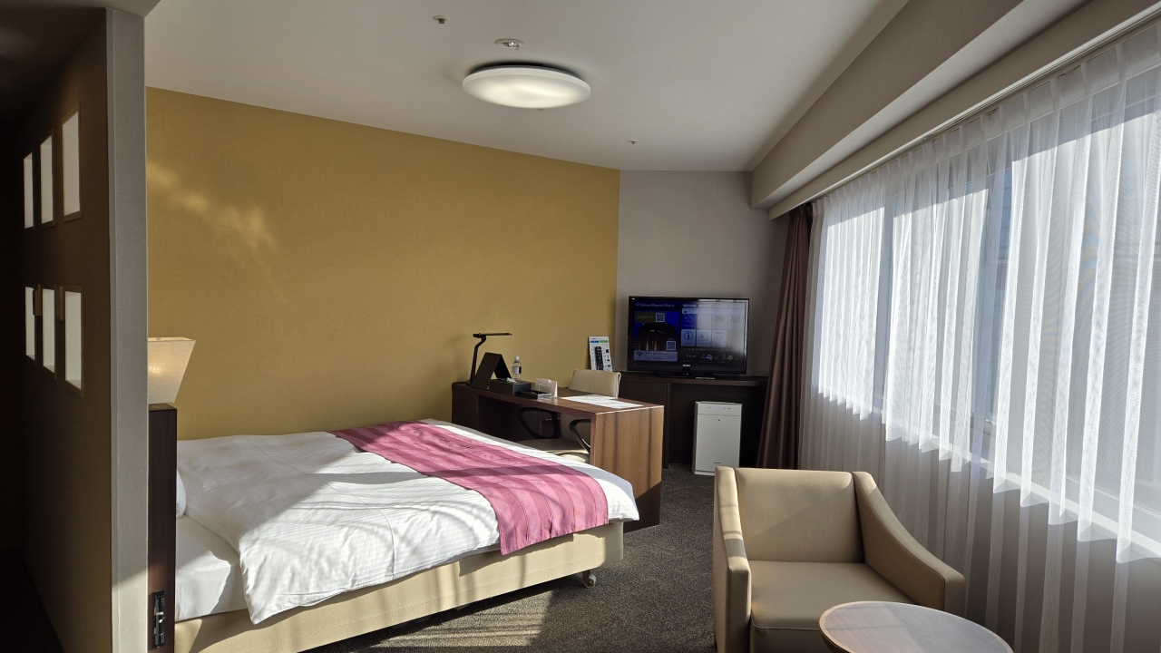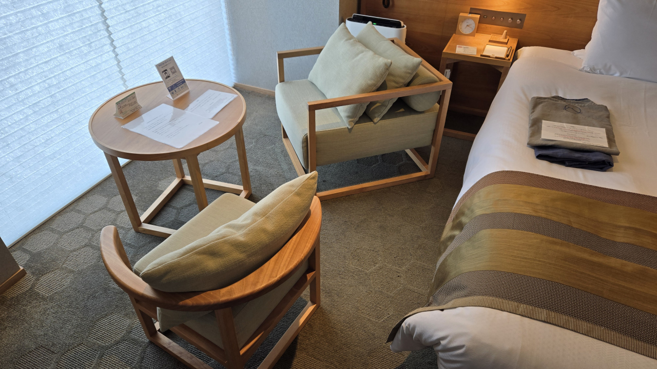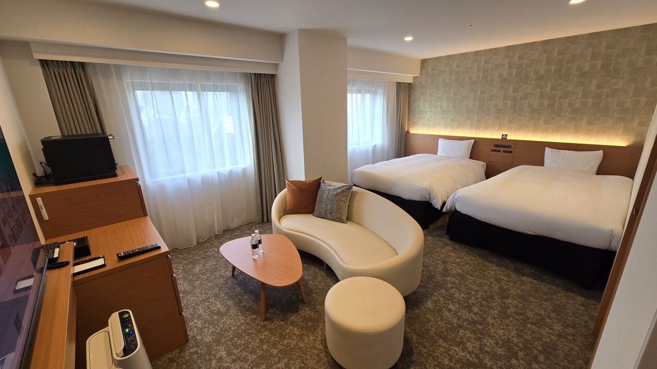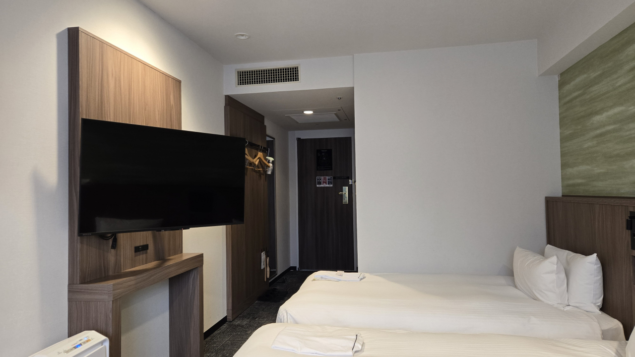 2024年4月に9〜11階がリニューアルされ今回はニュースタンダードフロアのツインルーム11階にアサインされました、部屋はシモンズのデュベスタイルのベッドメイキングに、壁掛けのテレビ(角度が動きます)、加湿空気清浄機で、家具のレイアウトは窓側にソファーにテーブル、机、冷蔵庫等と使いやすくスッキリしていて良かったです