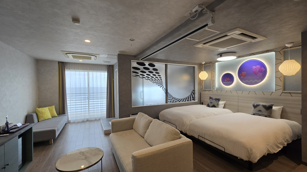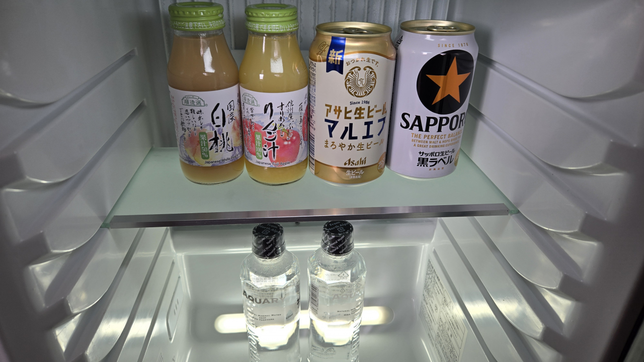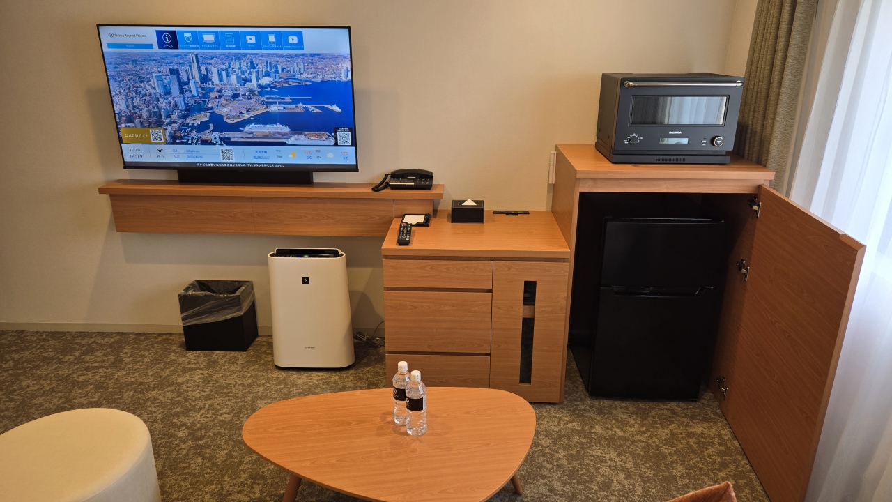 部屋は36㎡で1400mmのシモンズのベッド2台に、スマートテレビ、加湿空気清浄機、お風呂、洗面、トイレ独立、バスローブと快適に過ごせます、また海側は2重サッシになっていて冬場は暖かく過ごしやすいのも良いですね、アメニティは部屋に用意されていて、飲み物はミネラルウォーターとお茶があります