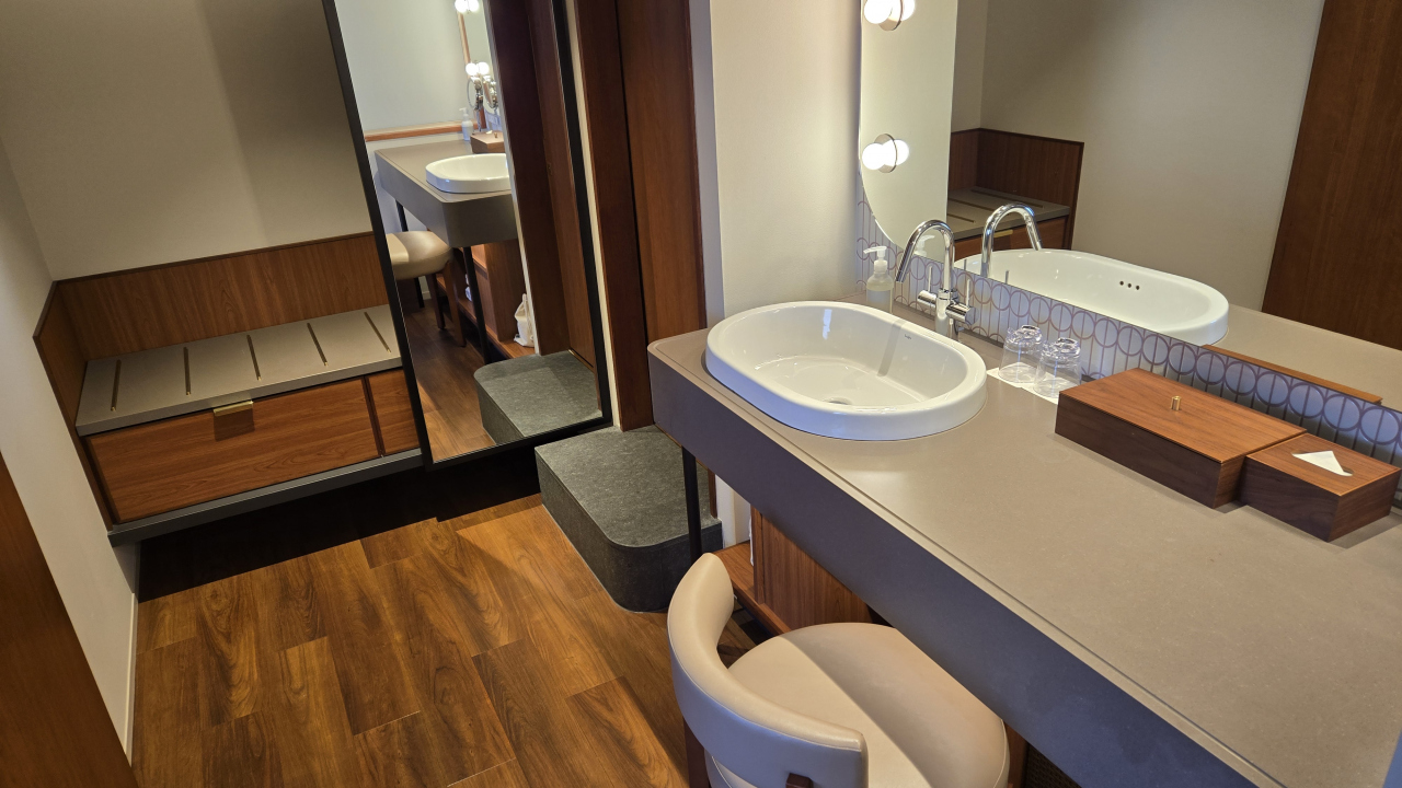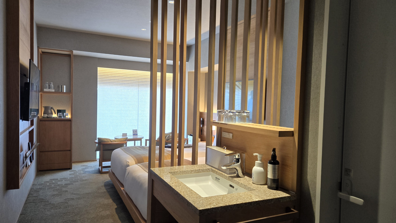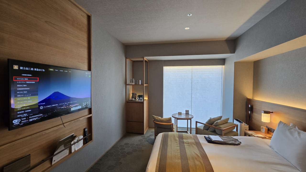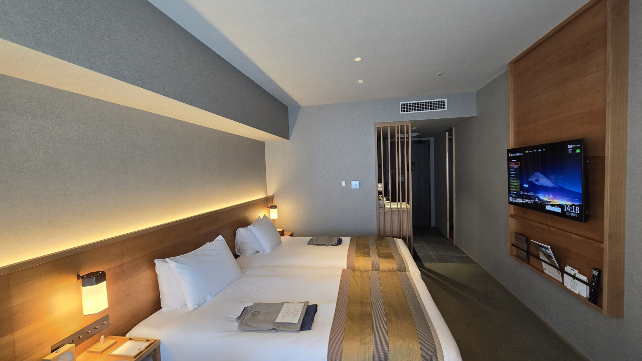 ホテルはまだ新しくスーペリアツインであれば富士山の眺望も楽しめそうなのでスーペリアツイン/ミドルフロア6階から9階を選び9階にアサインされました、部屋は26㎡でデュベスタイルのハリウッドツインのベッドメイキングに加湿空気清浄機、スマートテレビ、大きな窓側にテーブルに椅子があり、内装も木が多く使用され心地良い設えの部屋でした。水回りはお風呂とトイレは同室のユニットバスですが、洗面台が部屋にあり使いやすく良かったです。