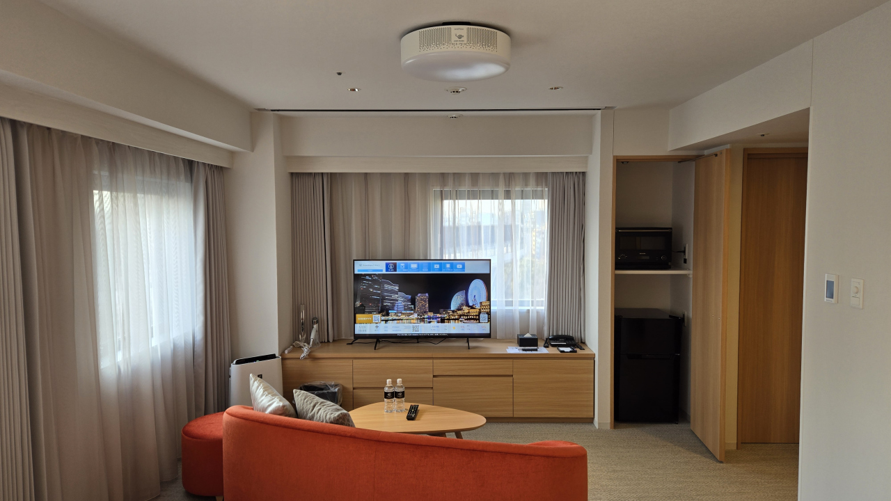 新しくリニューアルされたシアターツインは大型のプロジェクターと高音質スピーカーで部屋で映画や音楽が楽しめ良かったです、部屋は横浜公園に面した10階以上みたいで眺望は横浜公園越しのみなとみらい、横浜スタジアムが良く見え、お風呂、洗面、トイレ独立に、部屋に電子レンジ、ツードアの冷蔵庫があって便利で、ベッドはデュベスタイルのベッドメイキングに加湿空気清浄機、スマートテレビ、シャワーヘッド、ドライヤーはリファが導入されていて快適に過ごせました