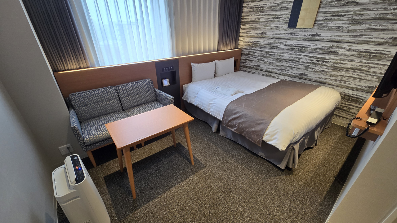 デラックスダブルは広さが26.9㎡で170cmのクイーンのデュベスタイルのベッドメイキングのベッドに、ソファーにテーブル、加湿空気清浄機、大型のテレビがあり一人でゆっくり過ごすには快適な広さでお気に入りです。