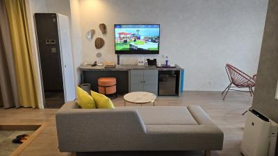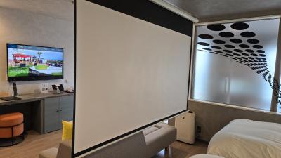 ベッドはデュベスタイルのベッドメイキングに高反発で寝やすくリモコンでリクライニングも可能でベッドでゆっくりしやすく良かったです、また大型のスマートテレビの他に100インチのプロジェクターで映画やユーチューブ等も楽しめるので、天気が悪い日でも楽しめる設備としても良いですね、その他ジャグジー付き室内バスにリファシャワーヘッド、リファドライヤー、LGスタイラー、加湿空気清浄機等で快適でした。