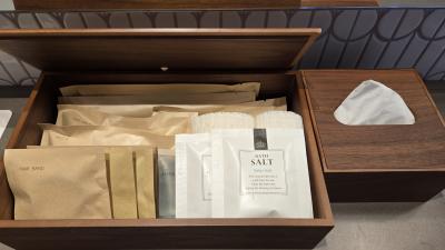 アメニティは1階のアメニティバーで必要な物を持っていきますが、オリジナルのドリップコーヒー、緑茶、入浴剤に基礎化粧品があるのも良いですね。