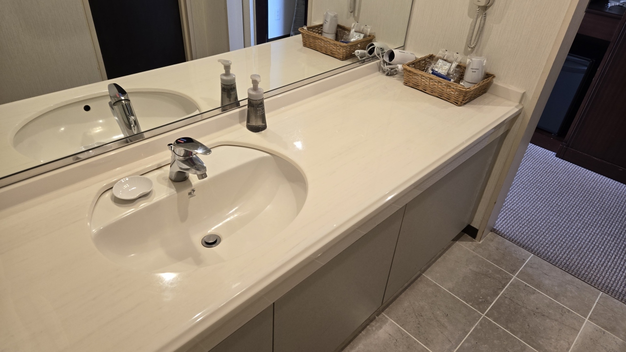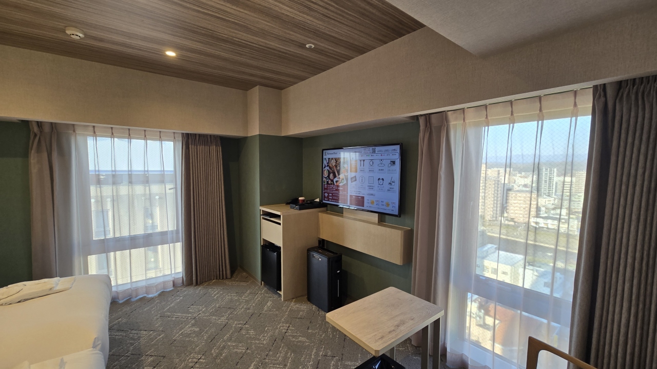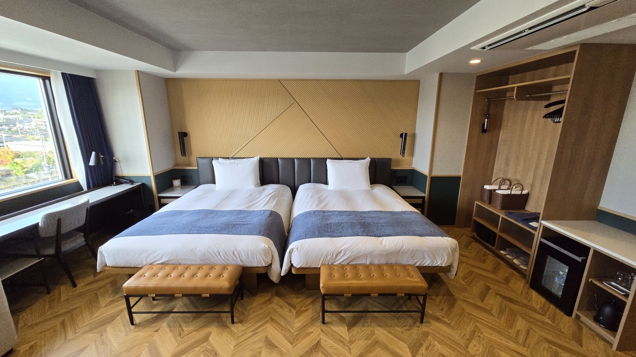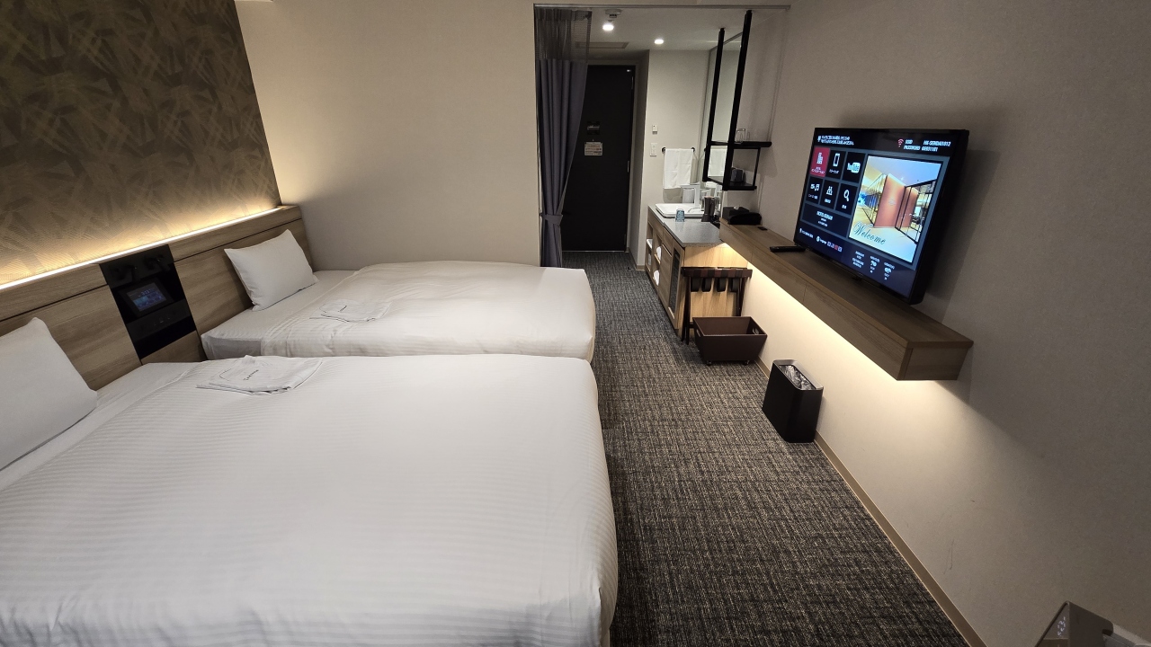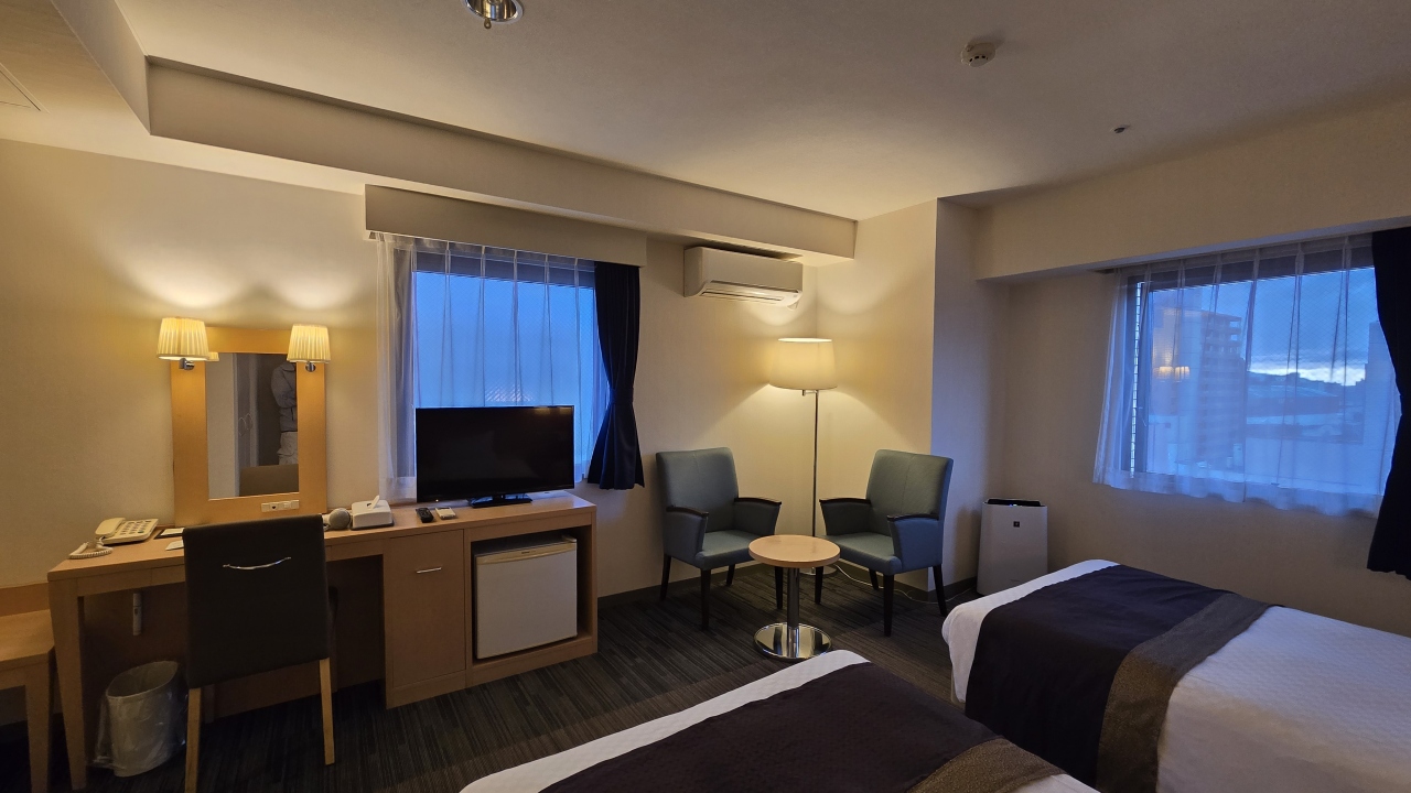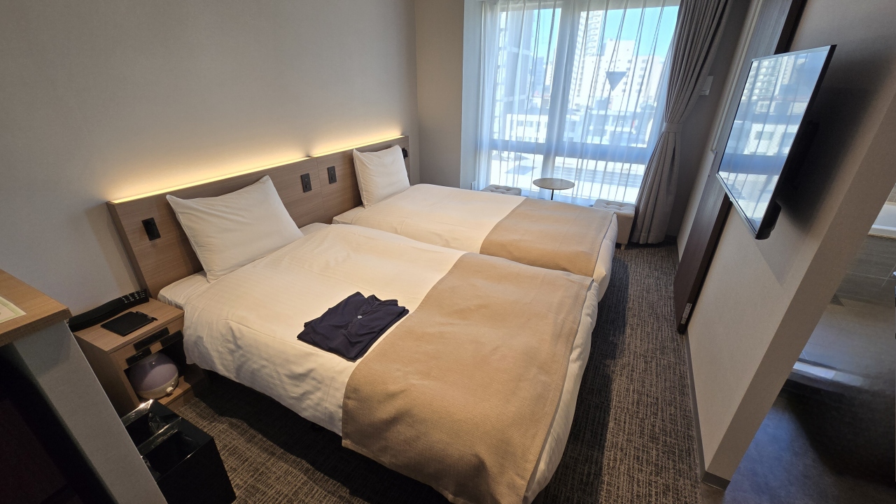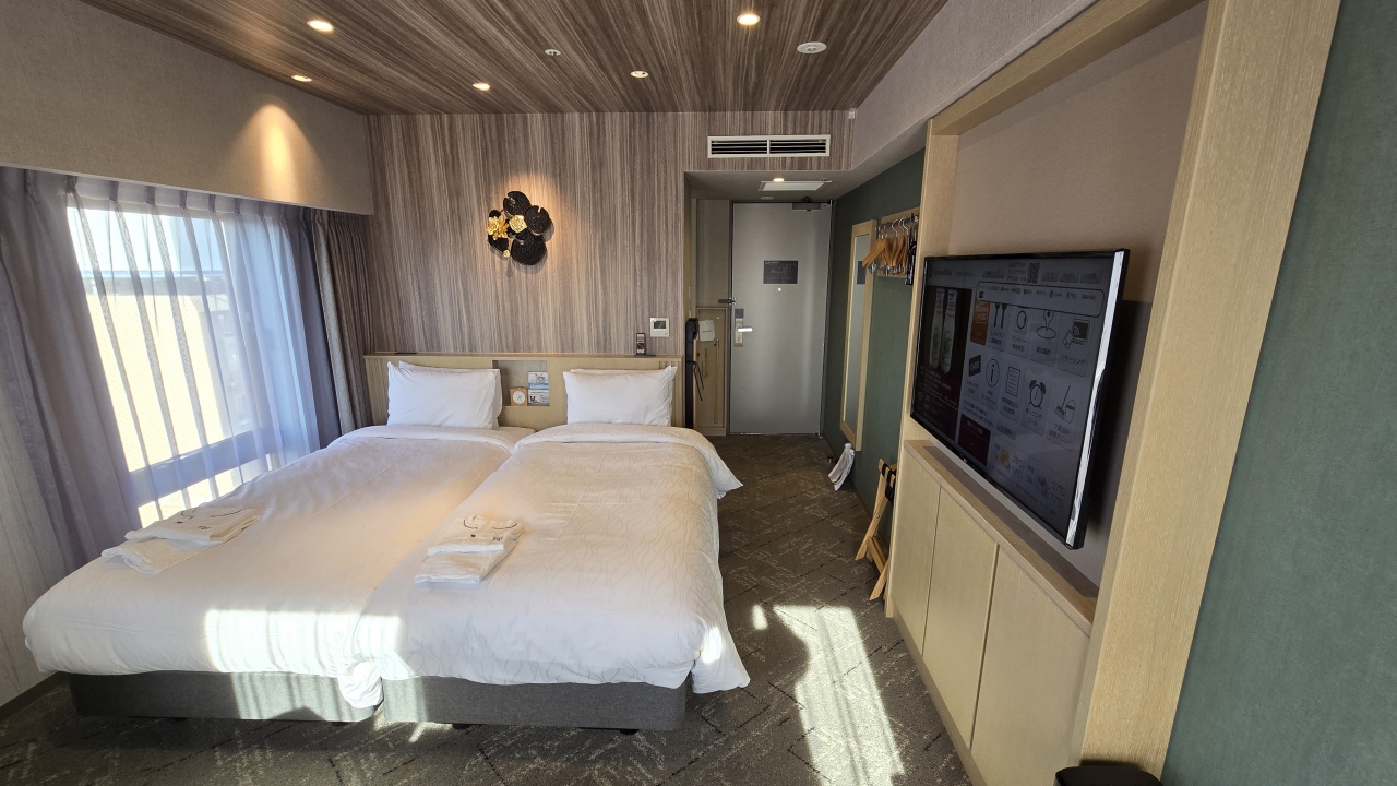 部屋はツインにしてはコンパクトな20㎡ですが良く考えられていて、デュベスタイルのベッドメイキングにスマートテレビ、冷蔵庫はツードアで連泊には便利でした。水回りはお風呂(ビューバス)、洗面、トイレが独立で、洗面カウンターが広くとってあり便利でした。ツインの部屋は部屋に加湿器が用意してありました。