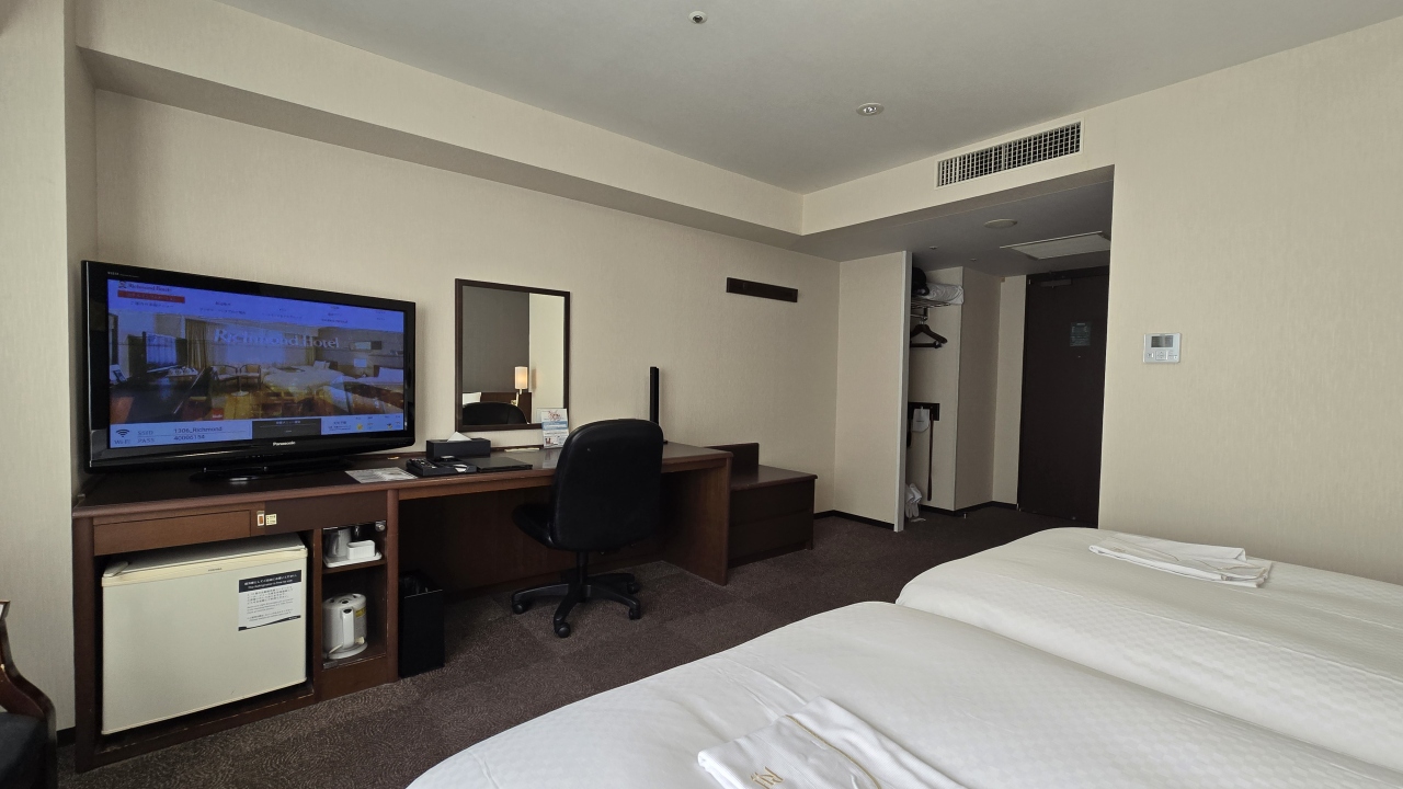 宇都宮駅前にあるリッチモンドホテルは隣同士に駅前店にアネックス館があり今回は駅前店のツイン26㎡に宿泊しました、部屋はリッチモンドホテル標準のデュベスタイルのベッドメイキングに加湿空気清浄機、テレビもスマートテレビでユーチューブ等も見られます、またツインの部屋のシャワーヘッドがリファなのも良いですね。