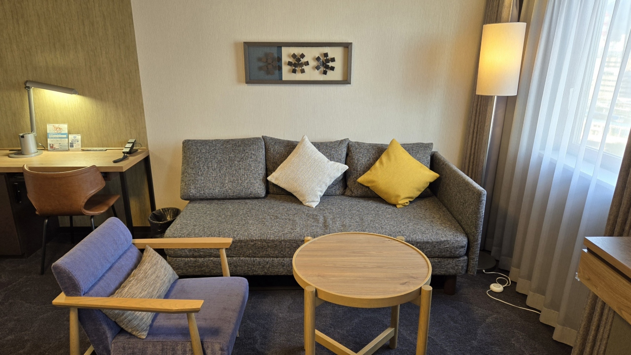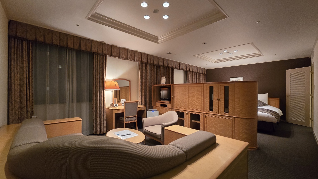 ホテルに1室のみのジュニアスイートは最上階14階にあって線路と逆側に位置します。部屋は50㎡で入口側にコーナに配置されたソファーにテーブルがあり、奥にベッドスペース、水回りがあります。ベッドはシモンズのデュベスタイル、加湿空気清浄機と快適でした。スイート以外はテレビやUB等リニューアルされてますが、スイートの家具等はきっとオープン当時の物で少し歴史を感じるので少し手を入れたら良いのにと思いました。スペースは広いのでゆったりしていて良かったです。オークラニッコーホテルズに属しているので、接客も含めもう少し頑張って欲しいですね。朝食は仙台名物の笹かまぼこ、ずんだ餅、牛タンカレー等もあって楽しめます。