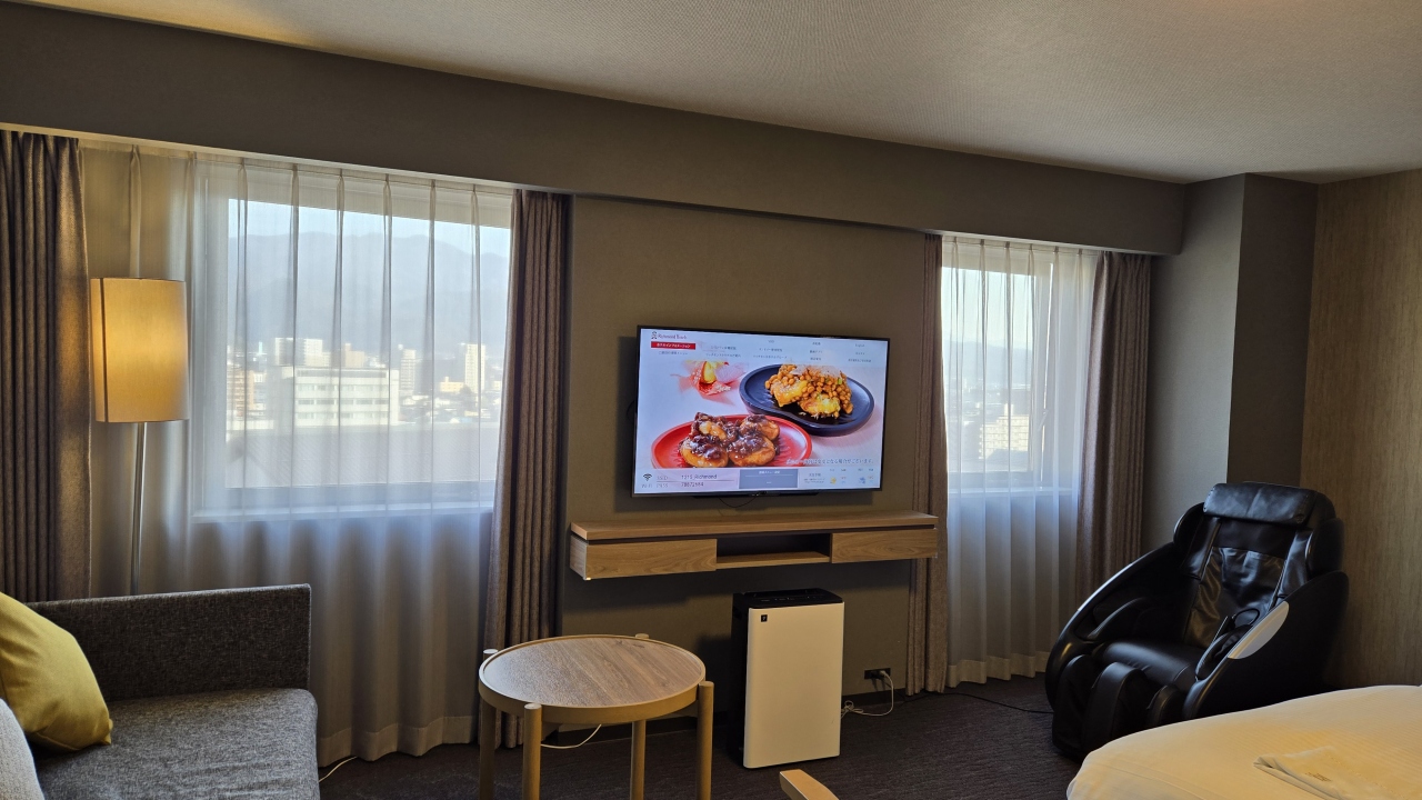 ホテルで1番広いロイヤルダブルに連泊でゆっくりしたました、部屋は11階で52㎡あるのでスペースにゆとりがあり、210cm幅のデュベスタイルのベッドメイキングのベッドに加湿空気清浄機、パナソニックのマッサージチェア、スマートテレビ、お風呂は独立で広くジェットバス付、洗面台、トイレも独立で快適に過ごせました。眺望はまわりに高い建物が少ないので福島の山々に囲まれ個人的には好きな眺望です。アメニティは部屋に用意されていて、通常の物の他に、ミネラルウォーター、ドリップコーヒー、緑茶等があります、スタッフの対応も良く心地よく滞在できました。