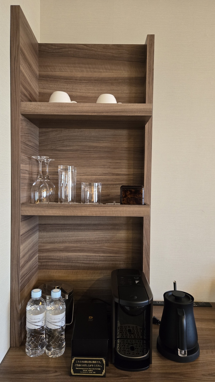 飲み物はミネラルウォーターにドリップポットでコーヒーにアールグレイ、緑茶があります、また種類は多くは無いですがルームサービスで食事が頼めるのもお気に入りです、眺望は川崎駅のラゾーナから都心方向の眺望が望め開放的です、スタッフの対応も親切で快適に過ごせました。- 旅行時期