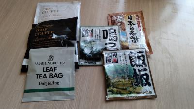 アメニティは1階に用意されていて通常の物の他にドリップコーヒー、緑茶、入浴剤、基礎化粧品もあって便利です。