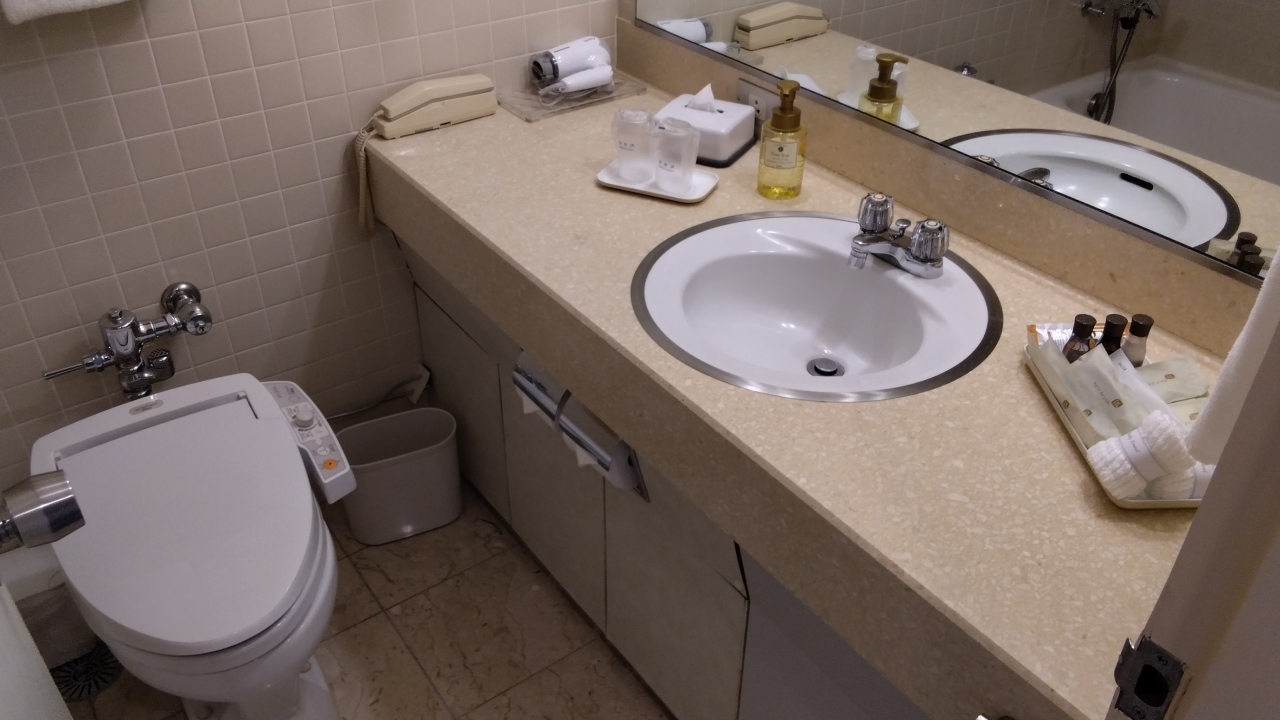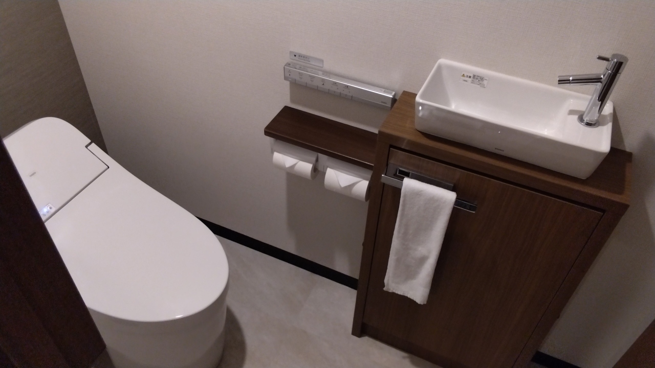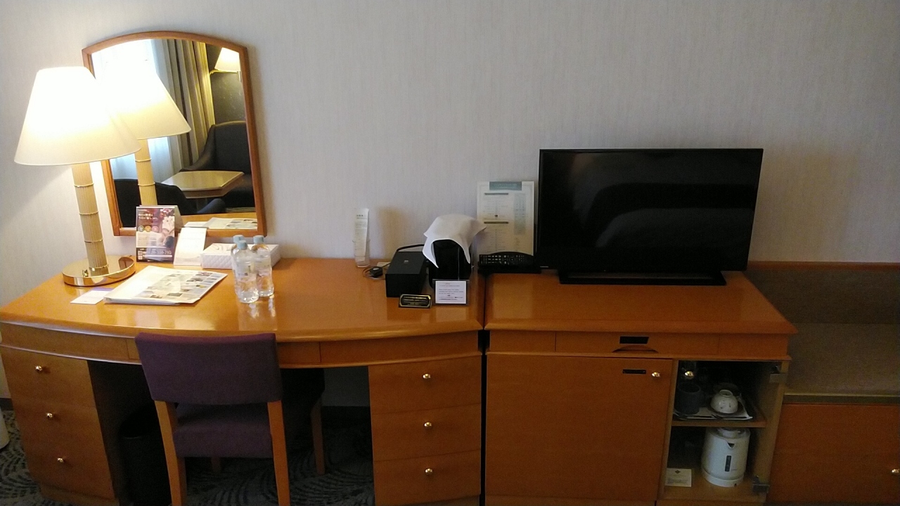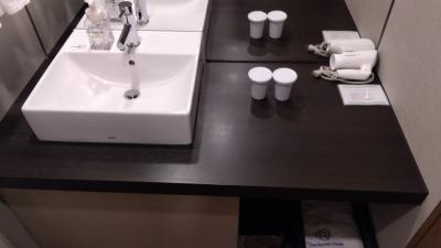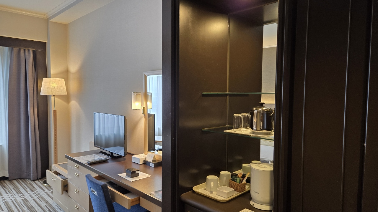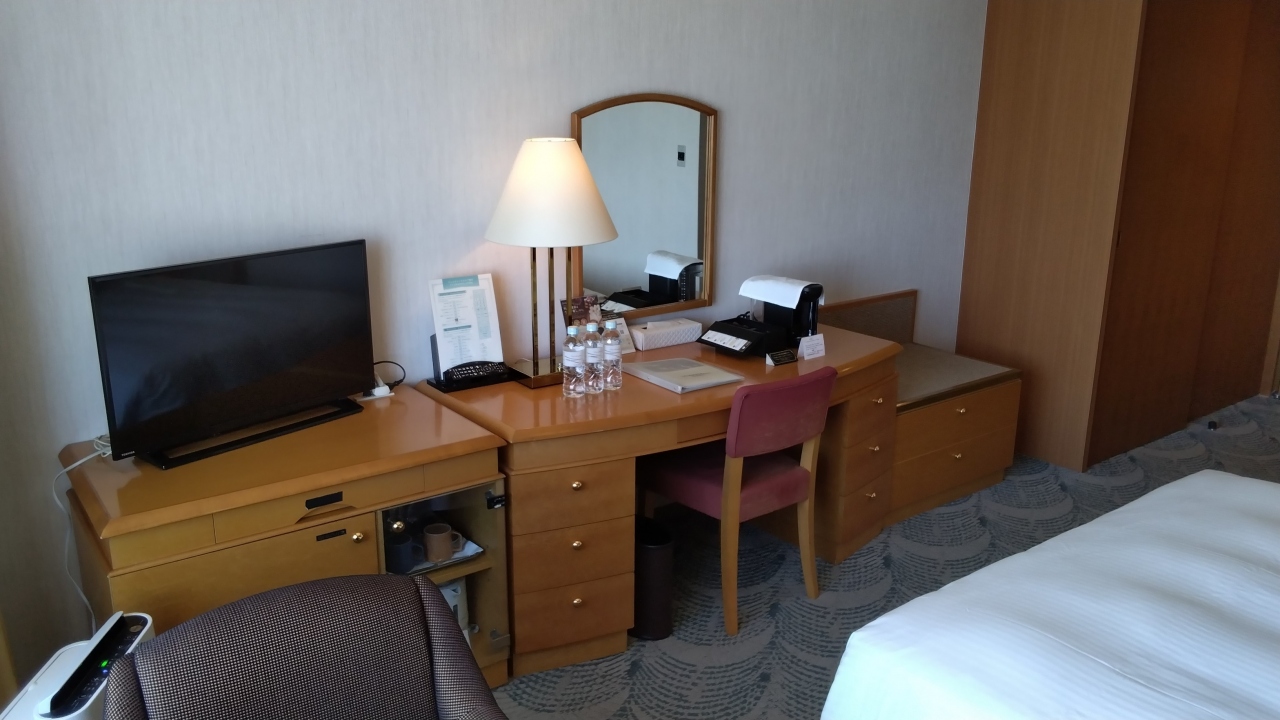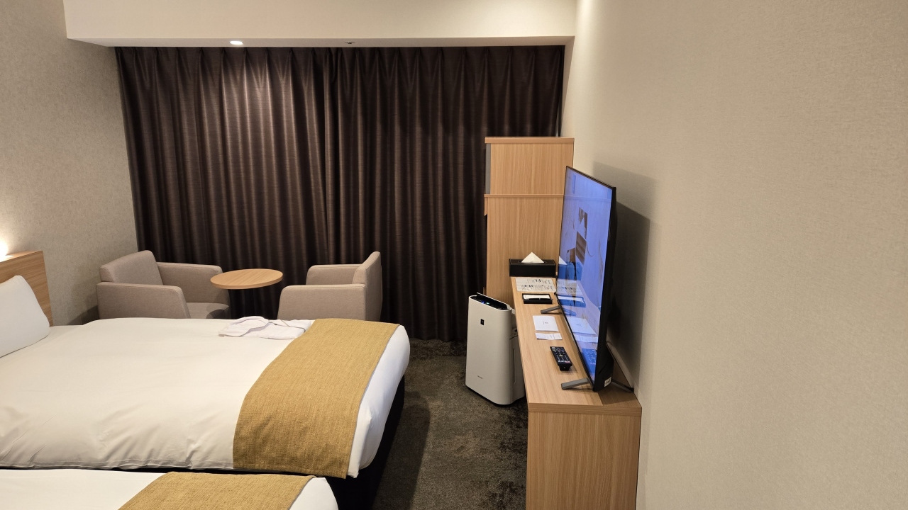 部屋はシモンズの140cm幅のベッド2台に加湿空気清浄機、スマートテレビで、水回りもお風呂、カウンターの広い洗面台、トイレ独立で、デラックスツインはバスローブもあるのでゆっくり過ごせます。アメニテイは部屋に用意されていて、飲み物はミネラルウォーターに緑茶、冷蔵庫にアイスペールが用意されていて15階には製氷機があるので便利です。