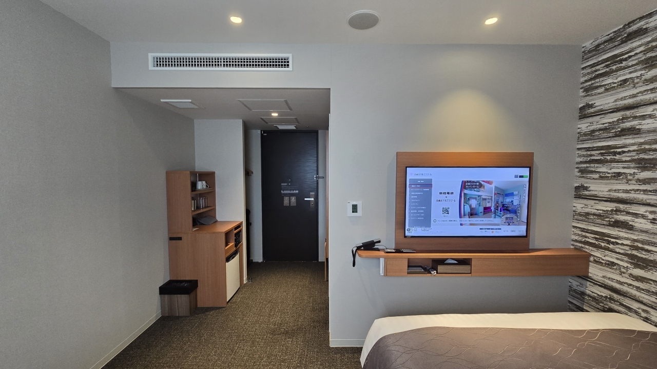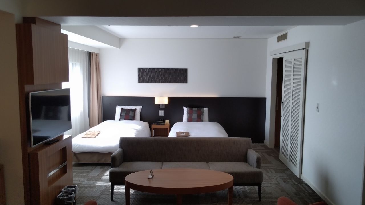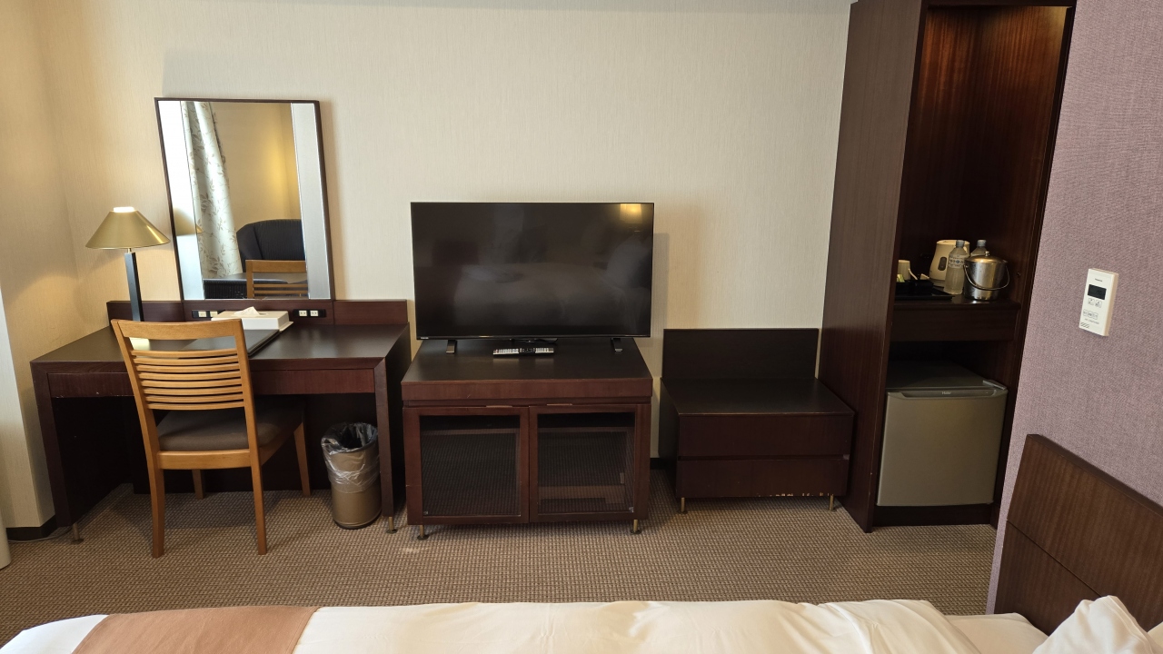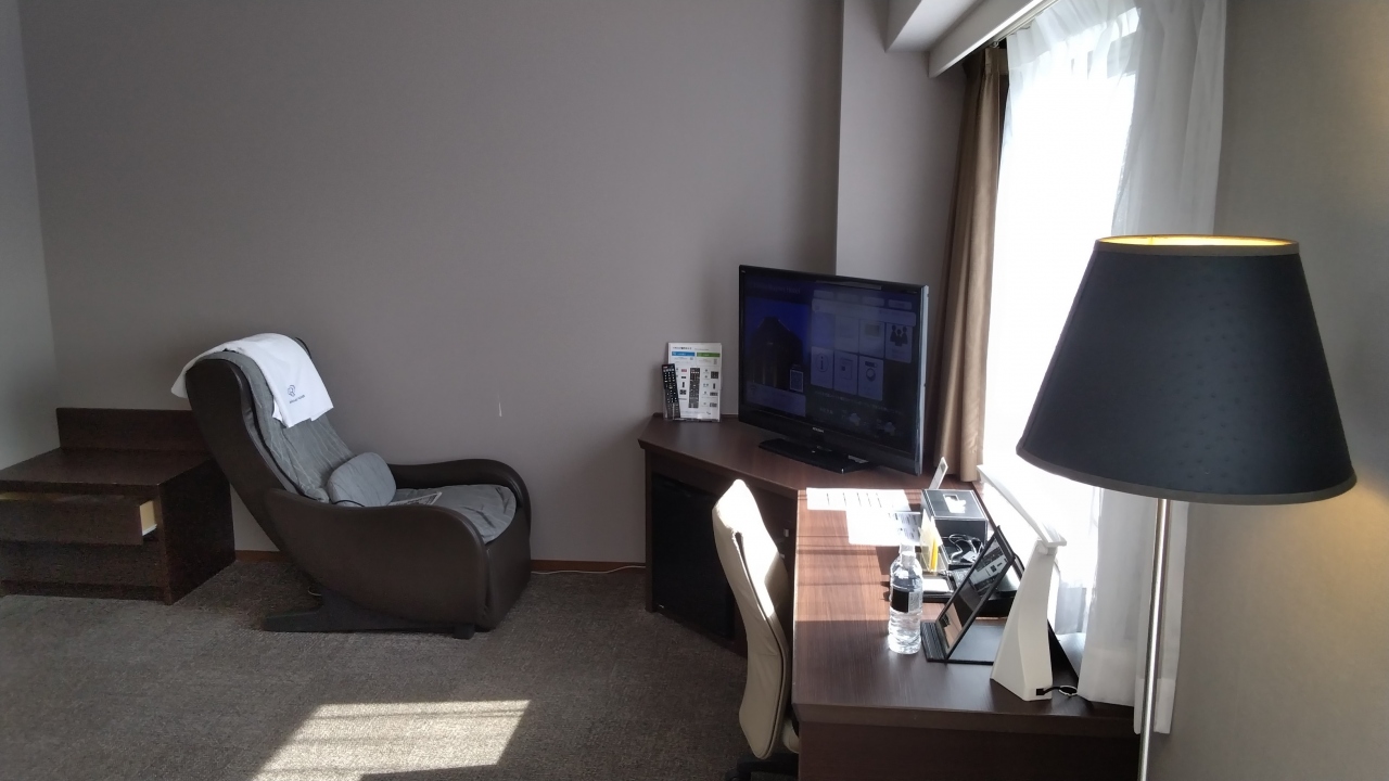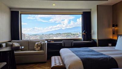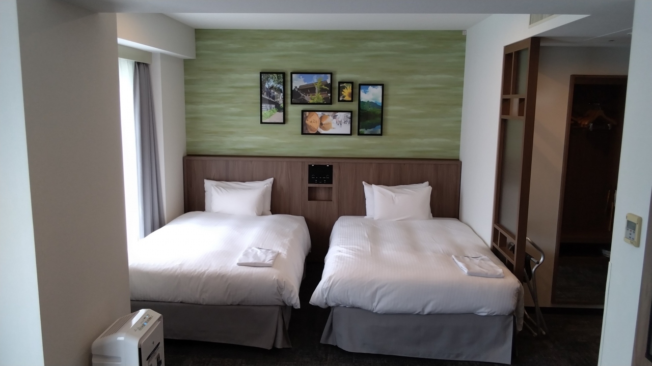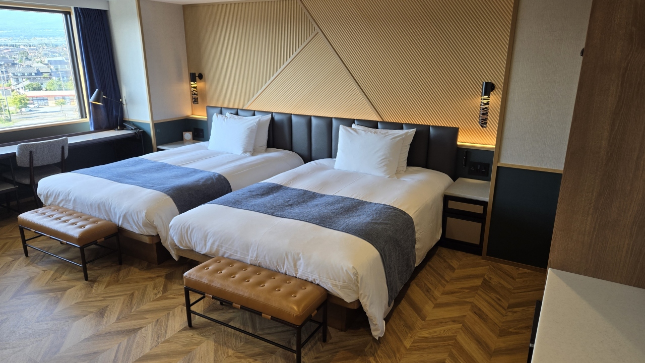 部屋はデラックスツイン27㎡に宿泊しましたが、デュベスタイルのベッドメイキングに、空気清浄機、最上階8階の部屋にアサインされたので北アルプスの山並みも望め良かったですが、室内電話が無くフロントに連絡は外線かLINE登録をして、その都度名前部屋番号等を伝えるのも不便ですね。家具やテレビ等の設備も少し古く感じました。また宿泊サービスで氷はルームサービス、フロントで電子レンジで温めのサービスをしてくれるみたいですが、レストラン営業が無いのであれば、製氷機や電子レンジも気軽に利用できる共用部にあれば良いなと思いました、共有部に有れば利用しますが実際頼みにくいですよね。