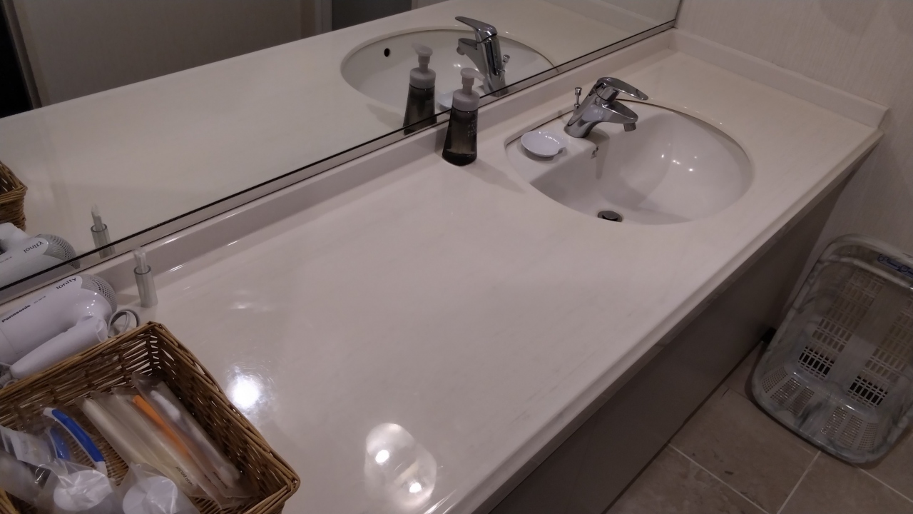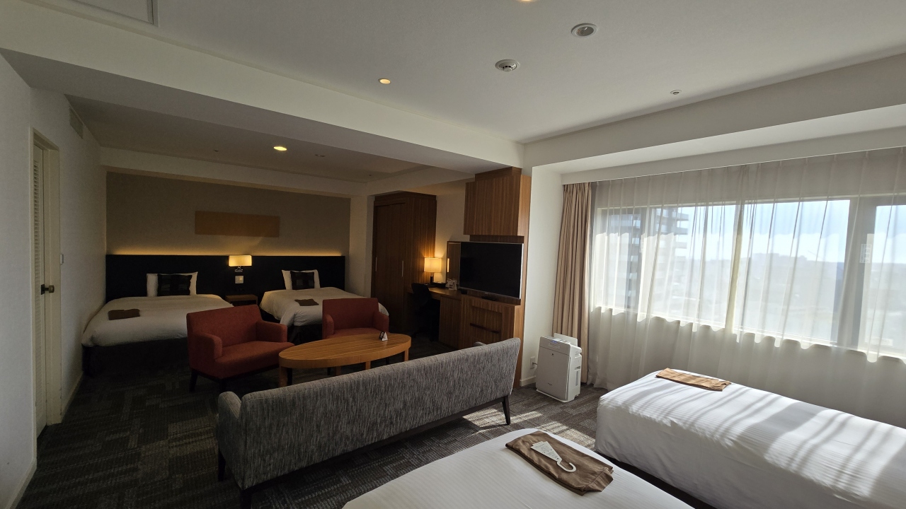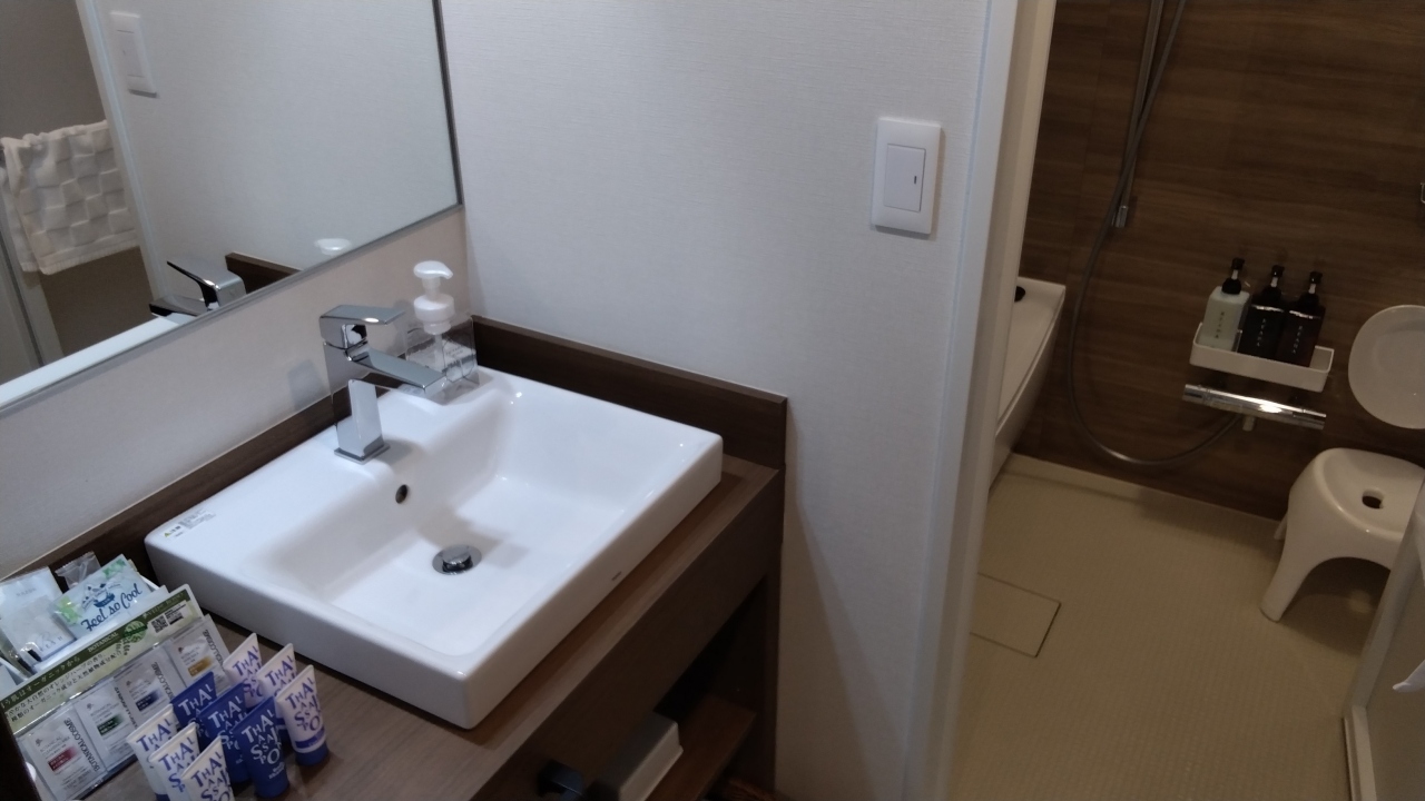 部屋はデュベスタイルのベッドメイキングのベッド4台に加湿空気清浄機、部屋の中央にテーブルにソファー、カウンター上に電子レンジもあり便利で、部屋はリニューアル済みで綺麗です。水回りは水栓等は交換されていて、少しは古さも有りますが、ツーボールの洗面台に、お風呂はトイレと同室ですが広めでゆっくりできました。