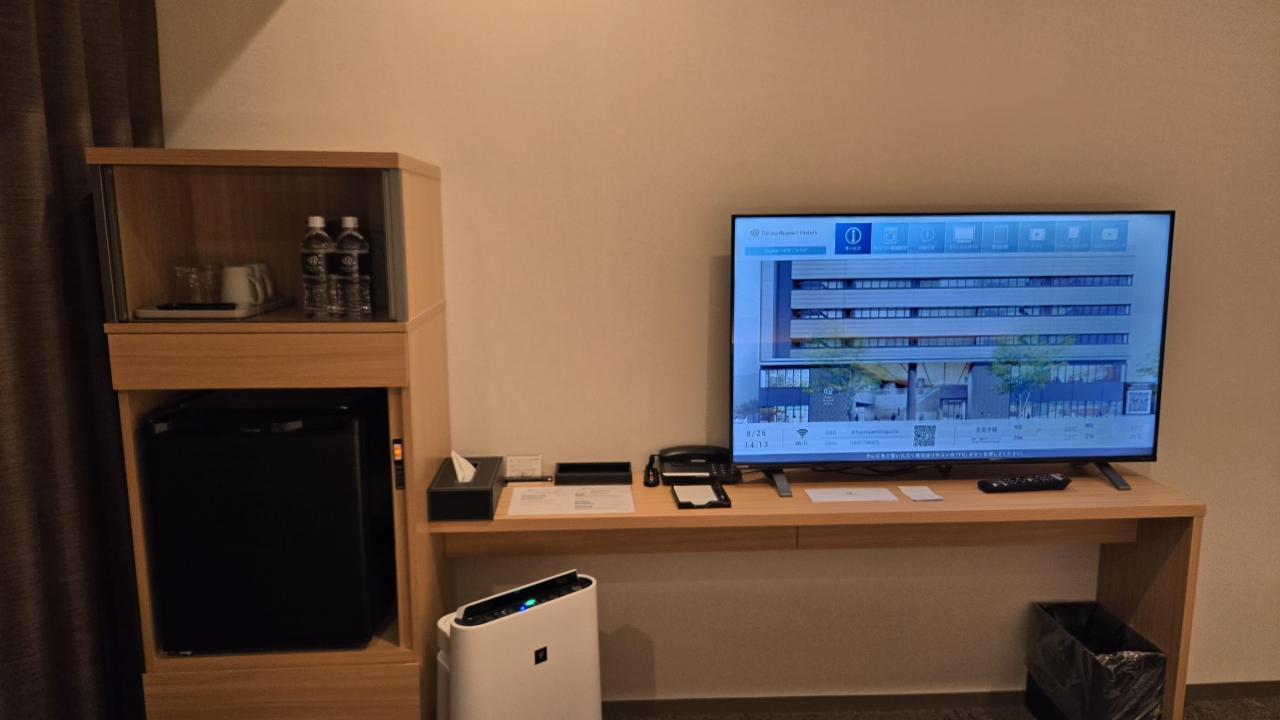 部屋はリッチモンドホテルスタンダードのデュベスタイルのベッドメイキングに新しい加湿空気清浄機、テレビはスマートテレビでユーチューブや自身のアカウントで映画等も楽しめ良いですね。また前回と同じ部屋でしたが丸テーブルが新しくなってました。アメニティーはホテル1階から必要な物を持っていきますが、どこのリッチモンドホテルでも、ドリップコーヒー、入浴剤、基礎化粧品があるのも良いですね。