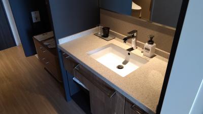部屋は140cm幅のベッド2台に、加湿空気清浄機、スマートテレビ、お風呂独立に、洗面台のカウンターが広いのが便利でトイレも独立です。アメニティは部屋に用意されていて、飲み物はミネラルウォーターに緑茶があり、部屋にアイスペールがあり15階には製氷機があるのが便利で、お皿やカトラリーが借りられるのも良いですね。
