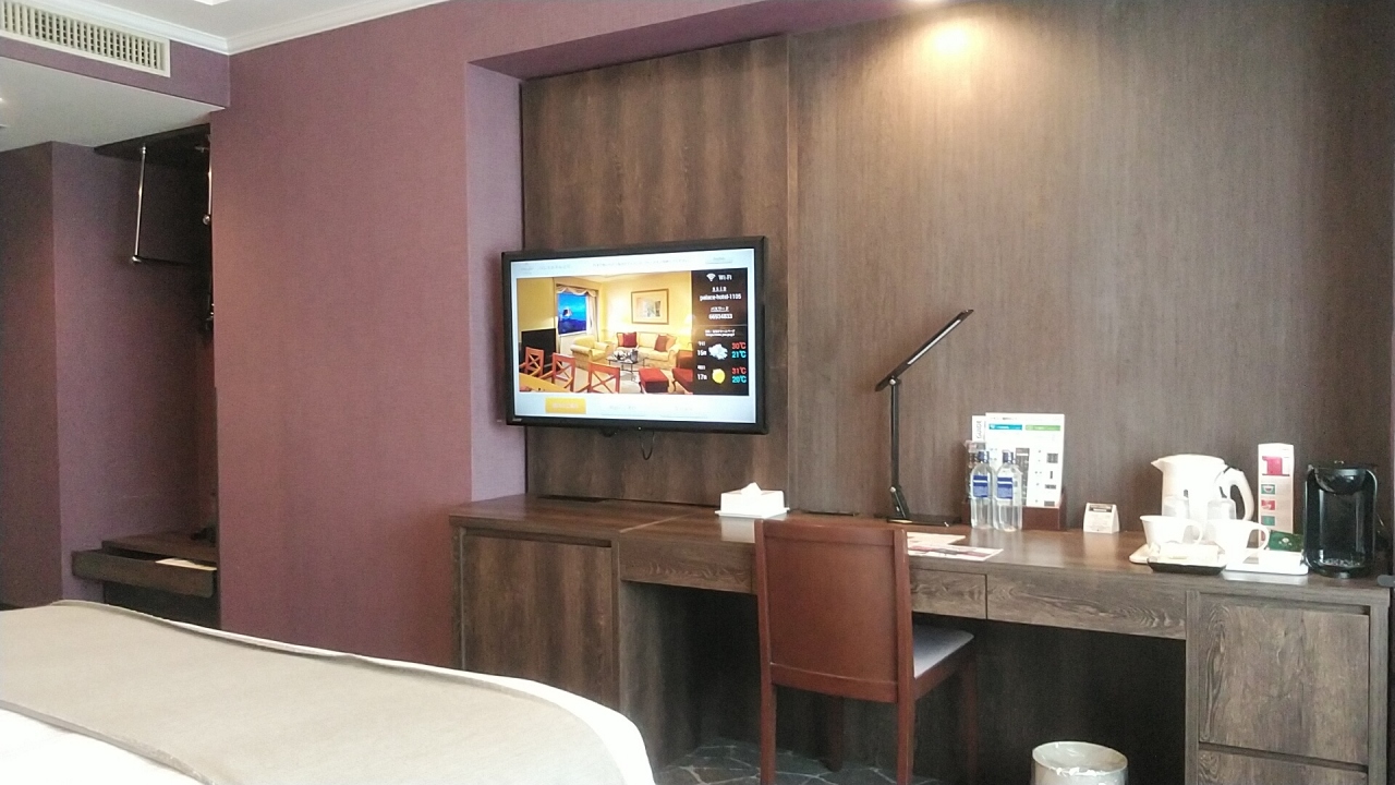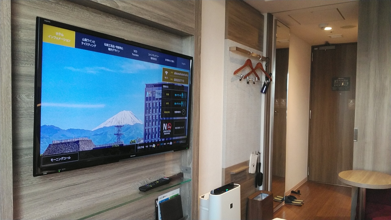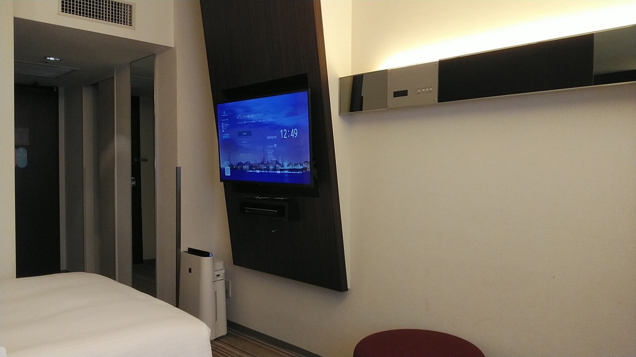 部屋はシンプルでスッキリしていて、デュベスタイルのベッドメイキングのベッドで寝やすく、加湿空気清浄機、壁掛けのスマートテレビで表記面積15㎡より広く感じよかったですね!