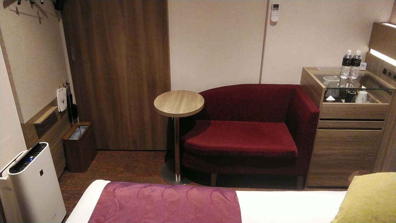 部屋はデュベスタイルのベッドメイキングのベッドに加湿空気清浄機、ミネラルウォーター、歯ブラシ、クシ、綿棒、粉茶等が部屋にあり、フロント階で、ドリップコーヒー、紅茶、基礎化粧品がもらえます。もちろんお風呂が独立で、洗面台のカウンターも広く便利で快適に過ごせました。