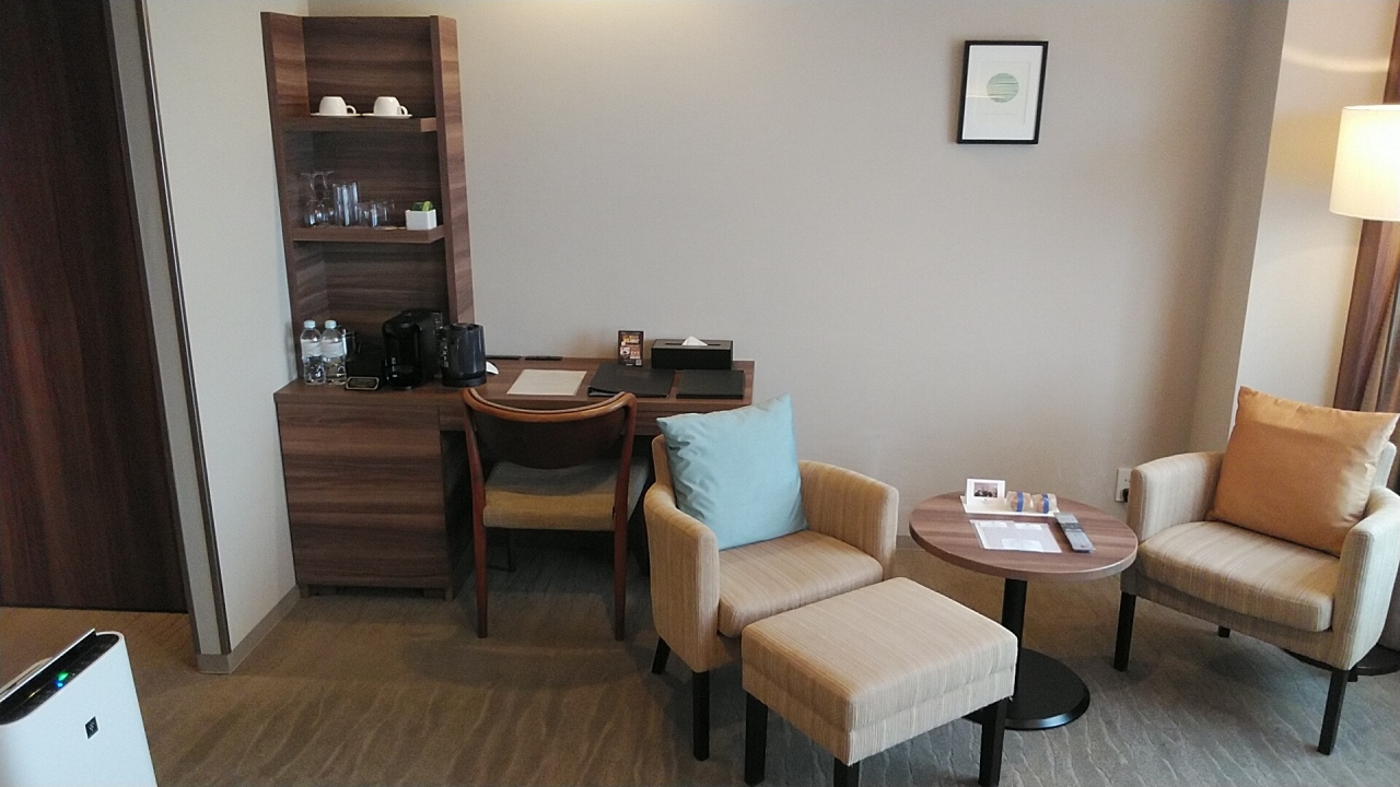 今回宿泊した部屋はホテル内で唯一お風呂、洗面、トイレ独立のプレミアムデラックスツイン40㎡でデュベスタイルのベッドメイキングのベッド2台に加湿空気清浄機、大型のスマートテレビにソファーにテーブルで快適に過ごせました。部屋は最上階の8階の駅のロータリー向きで静かで時々羽田空港に着陸の飛行機も見えました。またフロント階にアメニティバーがあり入浴剤や基礎化粧品のサービスもいいですね。