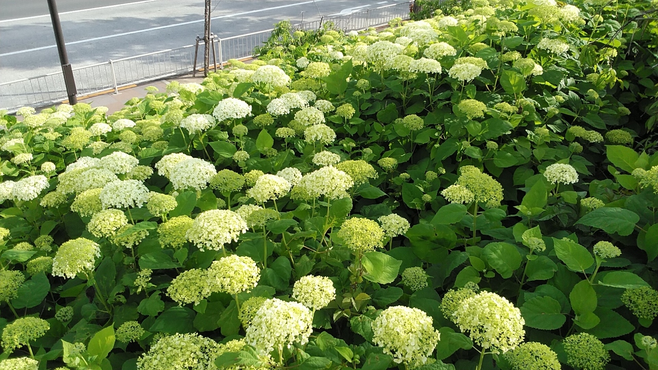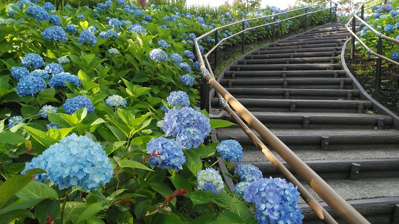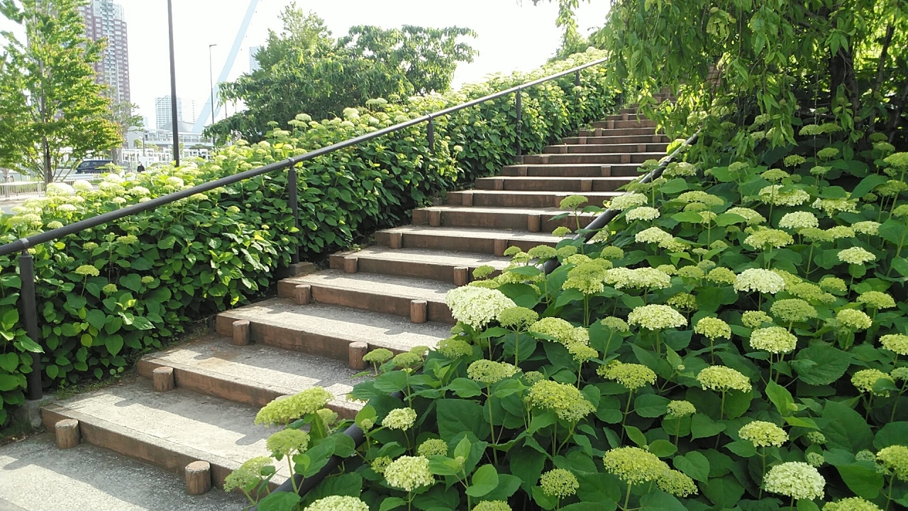 お台場の紫陽花のお勧めスポット1カ所目はシンボルプロムナード公園で東京テレポート駅のロータリーから道を渡ると今の時期 紫陽花が少し見えます。階段が2カ所あって1カ所はブルーの紫陽花、もう1カ所は白のアナベルが七変化中です。訪問は5月25日に行きましたが、ブルーの紫陽花は見頃で、アナベルは花付は良いですが見頃まではまだ時間がかかりそうですがお勧めです。画像も両方アップしますね!