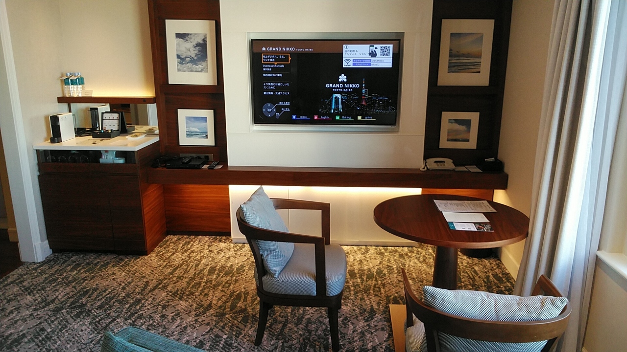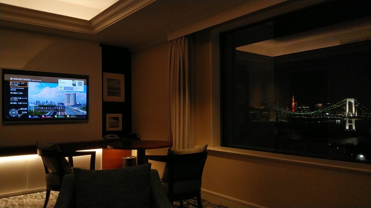 部屋は72㎡で2方向に窓がある22階にアサインされ、リビングスペースはレインボーブリッジビューでベッドルームは東京ゲートブリッジビューで天気も良く綺麗な景色を満喫でした。ベイビューフロアのコーナースイートはエグゼクティブフロアには位置しては無いですがエグゼクティブラウンジ等のサービスは受けられます。今回も10000円のホテルクレジット付きのプランだったので、カクテルタイムで軽くのんで、その後夜景を楽しみながら部屋でインルームダイニングをお願いしました。翌日の朝食もインルームダイニングで和食をたのみ景色を見ながら楽しみました。内装も綺麗でアメニティやホテル内の食事も充実していてお勧めでね!
