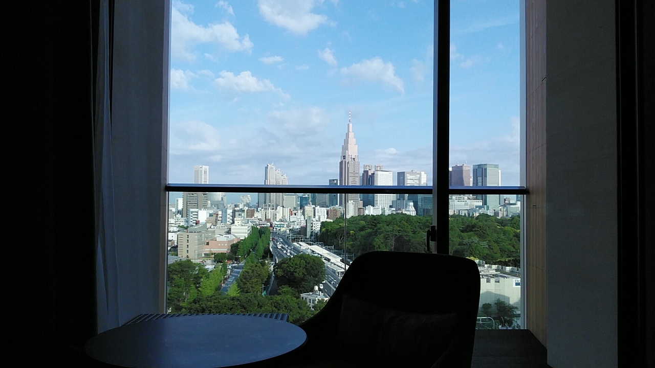 周辺環境は緑が多く都心の風景と新緑が感じられ良いホテルですね!部屋はバルコニーにデュベスタイルのベッド、洗面、浴室、トイレ独立でゆっくりできます。前回同様新宿側の客室で天気もよかったので窓をあけて新宿御苑越しの景色に風も感じられ心地く夕陽も綺麗でした。ホテル近辺に食事やコンビニが無いですがホテル2階のベンダーコーナーにコンビニの自販機に電子レンジ、製氷機もあるので小腹が空いた時にも便利ですね。夜テレビをつけたらホテル前の国立競技場でオリンピックテスト大会が行われていて、屋上から国立競技場を見ながら、心の中で応援できたのもよかったですね!翌日朝も天気も良くガーデンテラスで朝食もよかったです。
