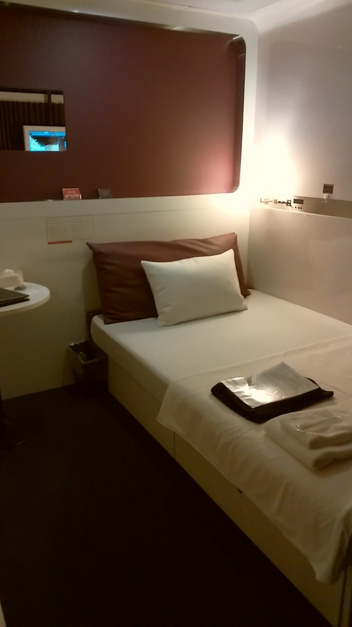 なんばの駅からは近く便利な場所ですね。はじめてだったので好奇心で訪問してみました。個室空間はベッド、加湿器、テレビと設備はまあまあですね。コンセントも2か所ありました。大浴場がありゆっくりお風呂に入れました。部屋と共有の廊下に鍵がないのが落ち着かなかったです。