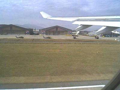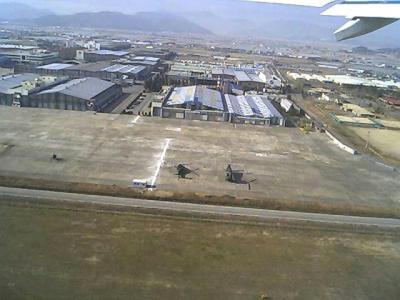 関西国際空港に向け離陸した時に滑走路の向こうに格納庫、