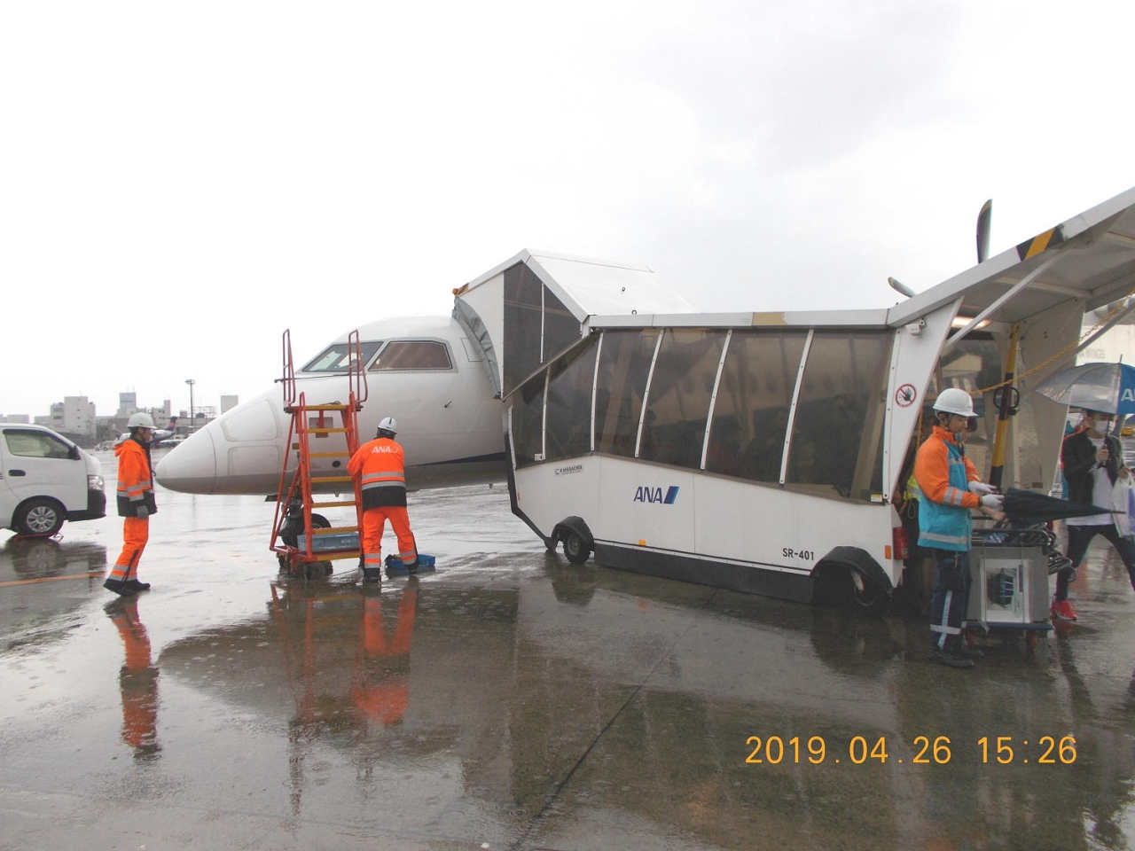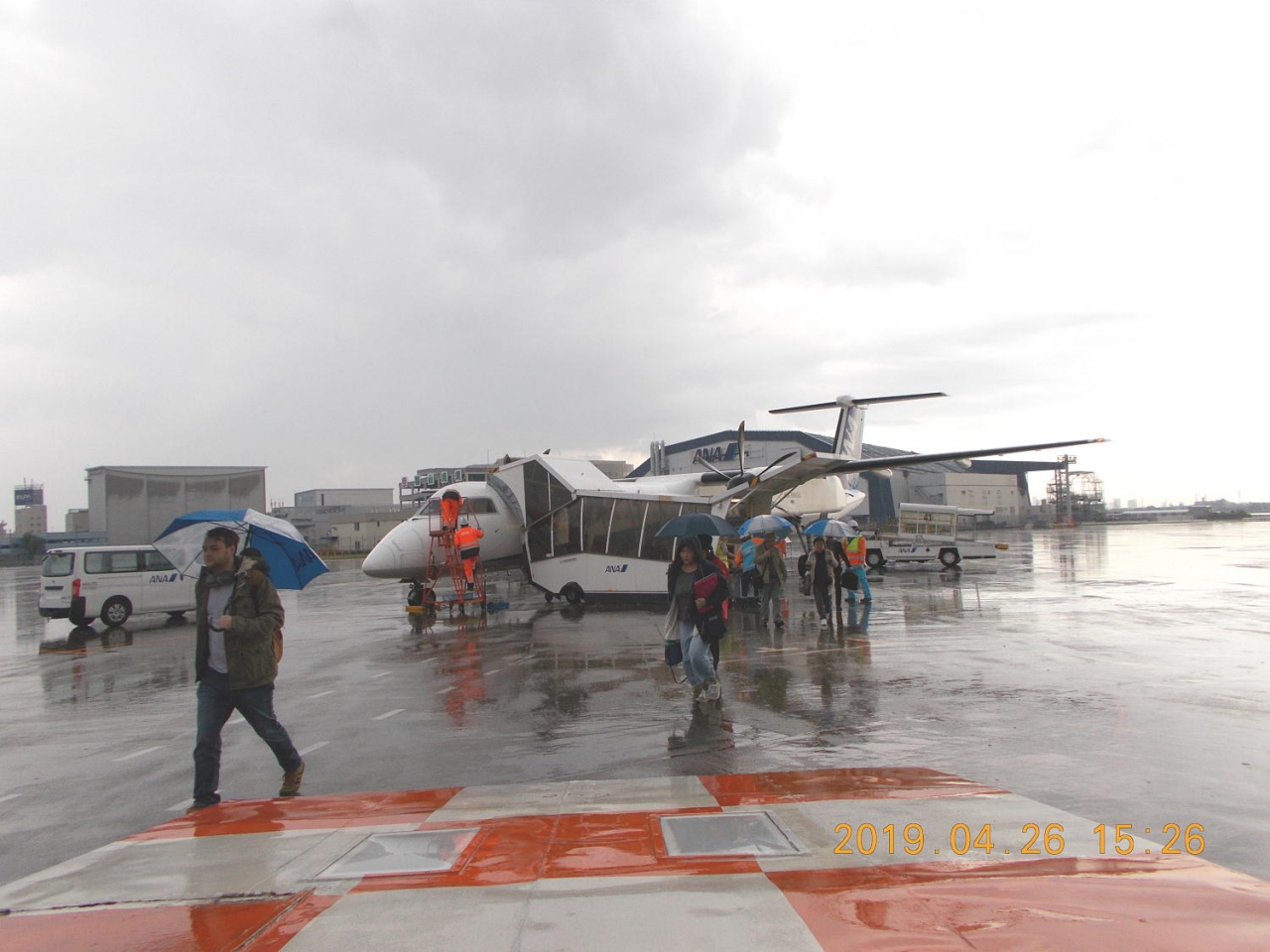 飛行機を降りてから傘をさし空港ビルまで歩きました。