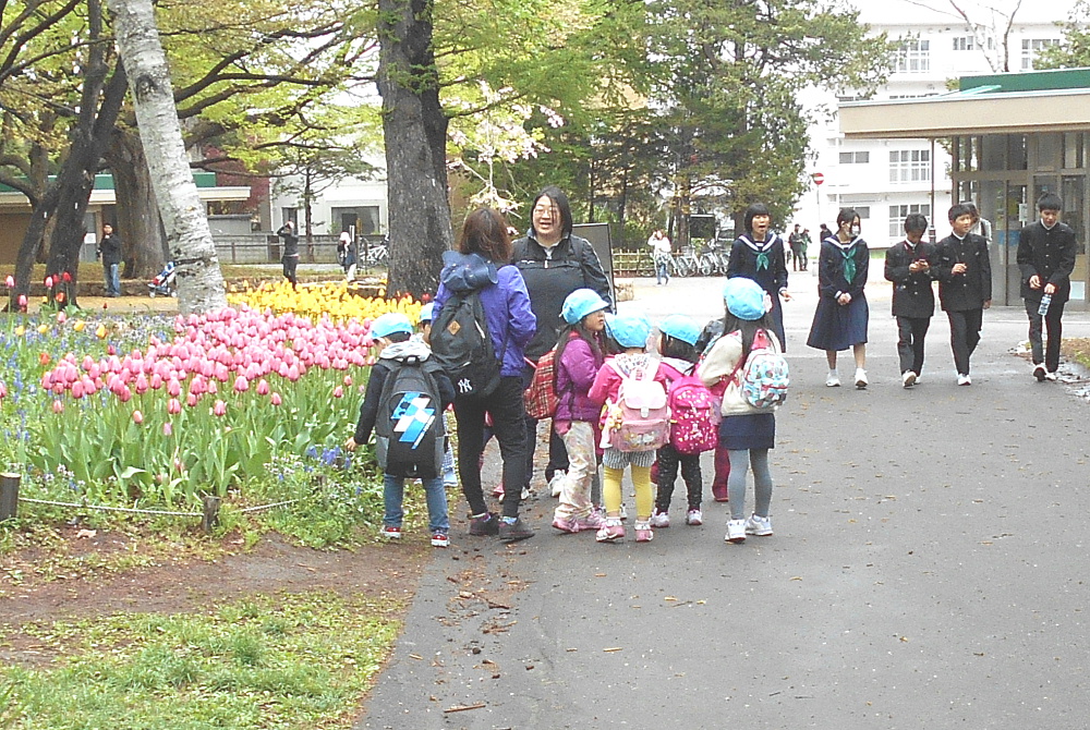 円山公園を歩いていると保育所の遠足の子供たちがいました。