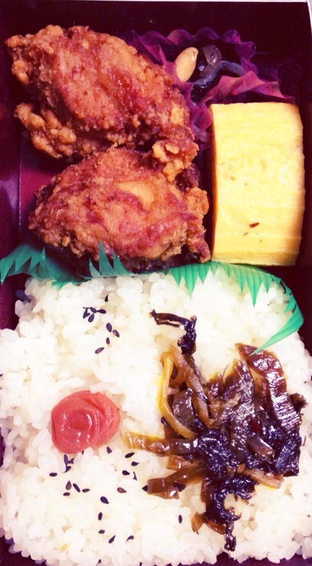 大きいから揚げ2個と、出汁巻き玉子、ひじきの煮物と梅干、高菜。