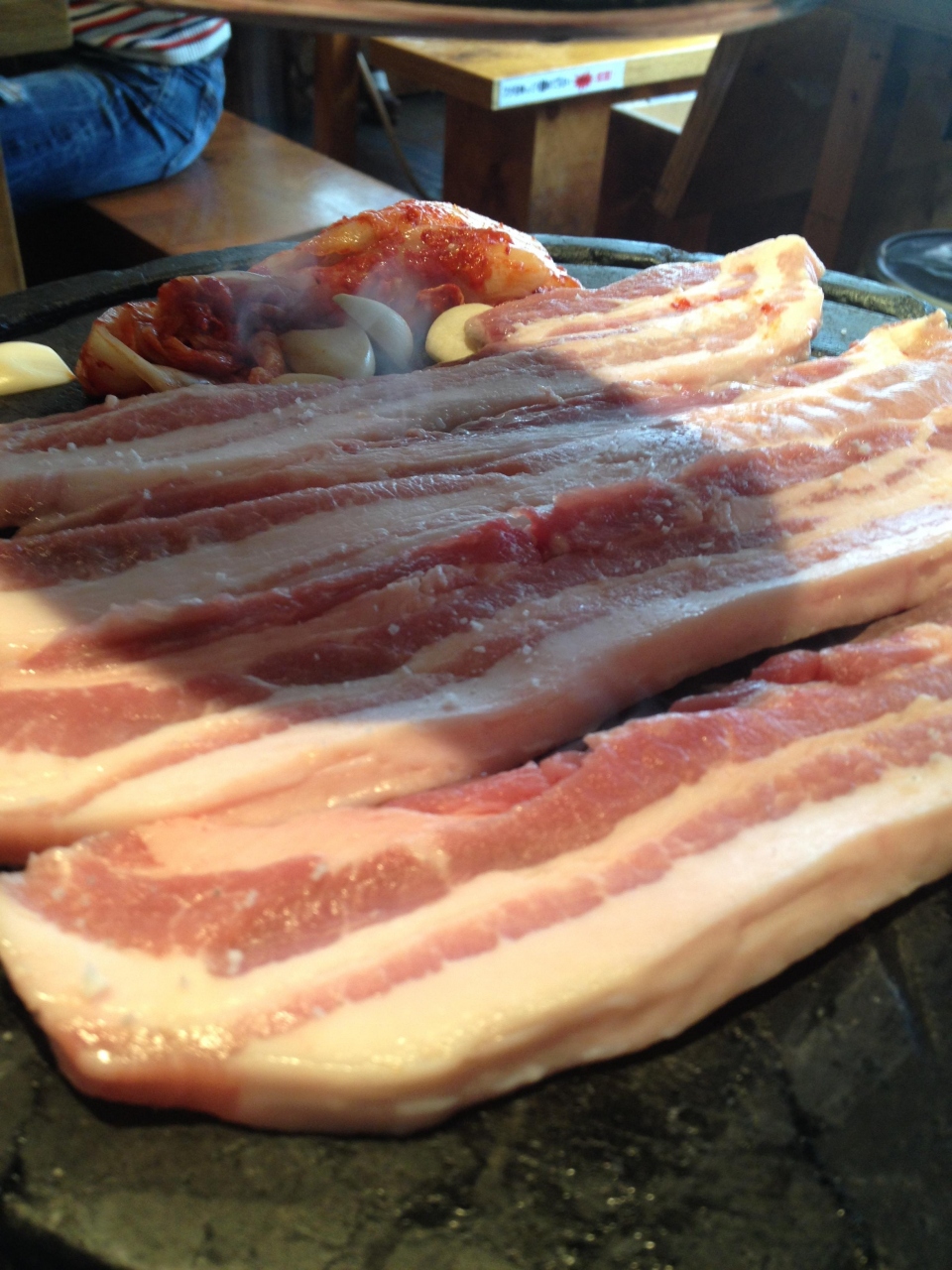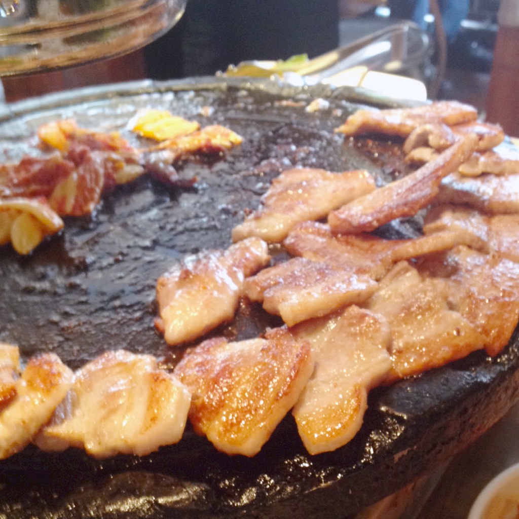 サムギョプサルという、豚バラ肉をキムチとともに焼いたものをがっつりいただきました。お肉のほかに、小皿料理が沢山きましたよ!