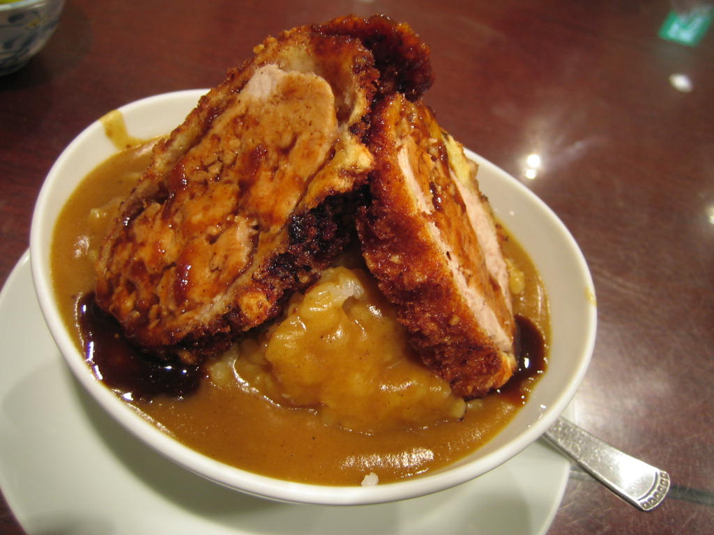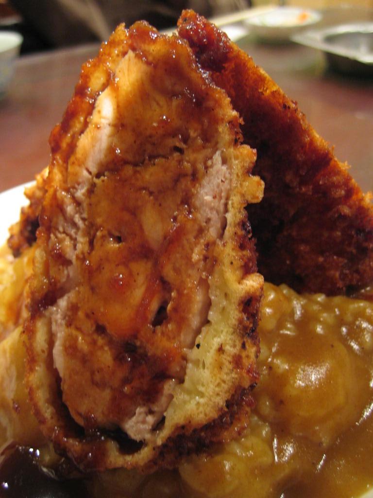 そこに、カツを乗せ、カレーをかけたものが出てきます。