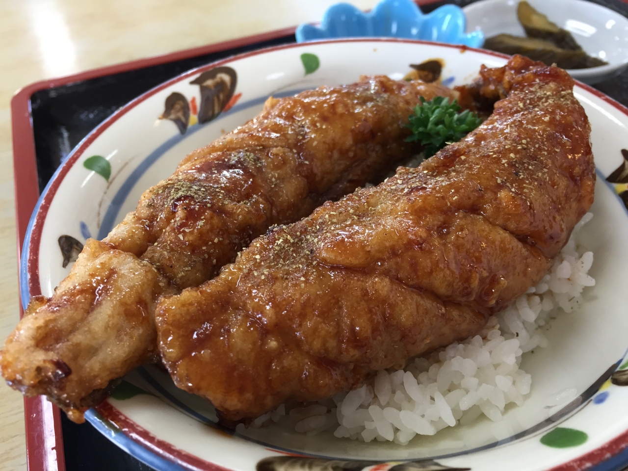 ほっけを軽く揚げて、たれをかけたものを丼にのせたものがこの花魚丼。