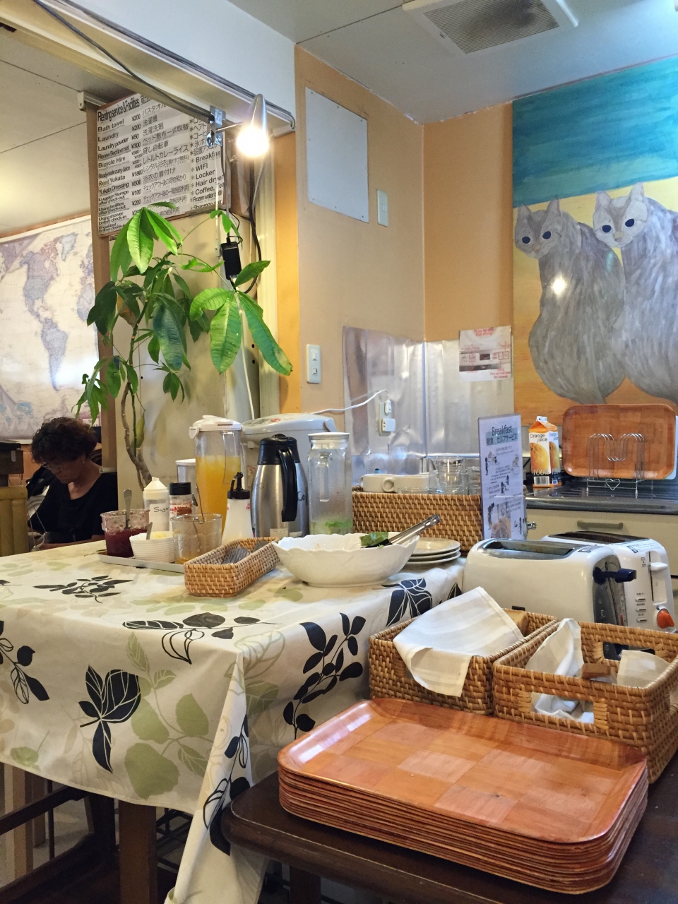 チェックインはカフェ営業終了後で、その夜の宿泊者が大きなテーブルで自己紹介などをします。宿の方が大変明るく親切なので、一人で泊まるの不安かも、と思う方も安心できます。ただ、個室などはなくふすまで隣の部屋と仕切り、見知らぬ方と隣同士でお布団、というのが無理!と思う方はやめといたほうがいいかも。