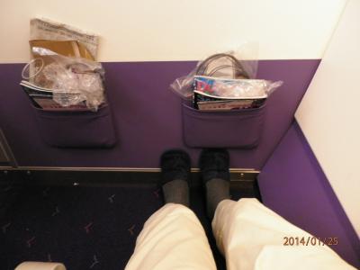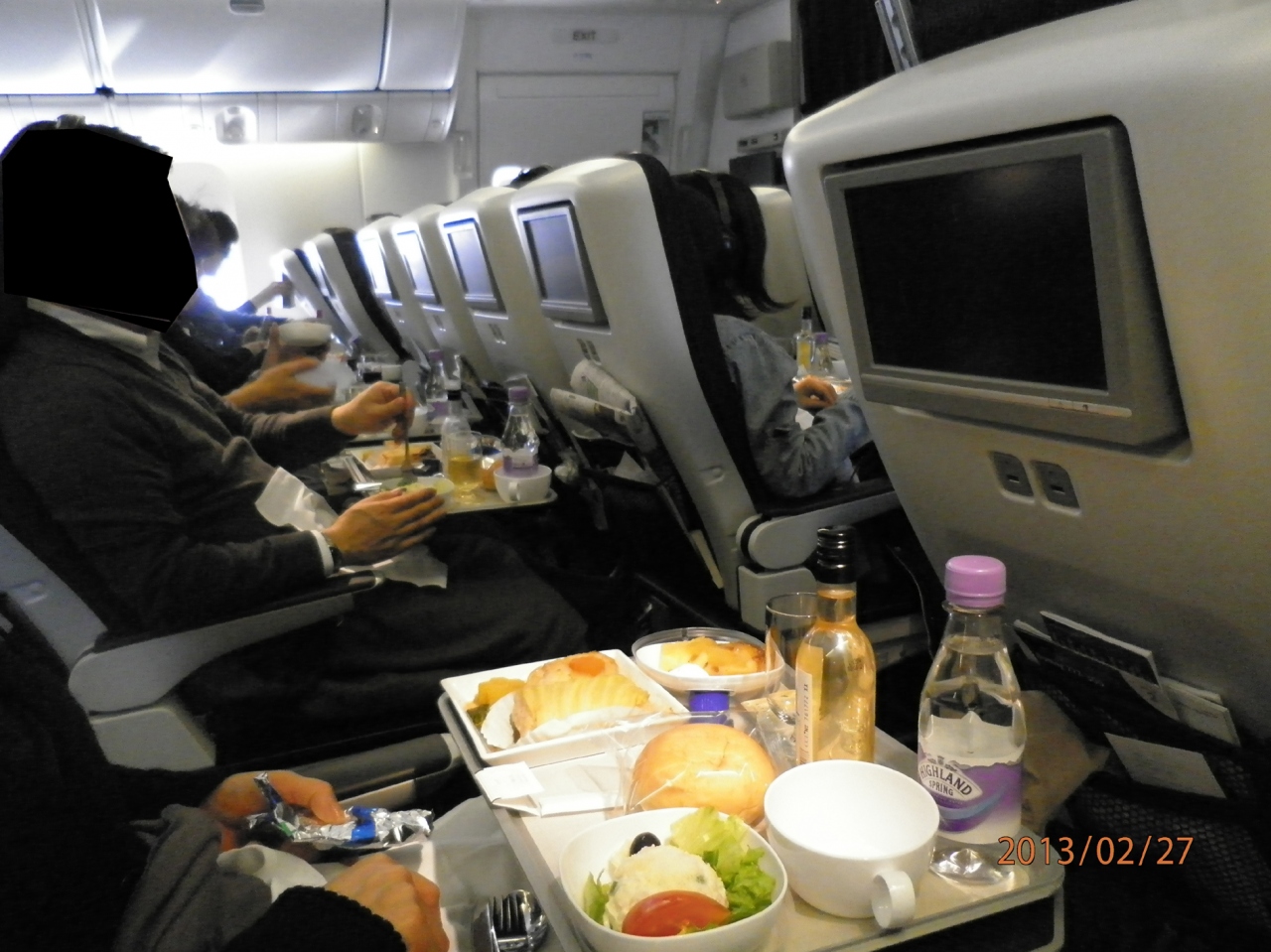 成田空港では「空席がある」とのことから、チェックイン時に旅行社から渡された搭乗券を破棄して右3席の通路側(H)と窓側(K)の真中を空けた座席を再指定し二人で3席の利用に成功しました。