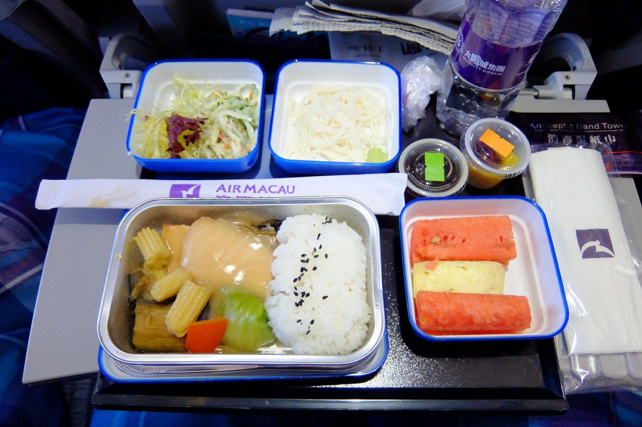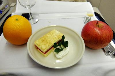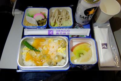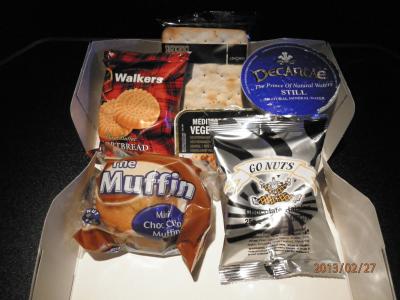 - 2食のうち、1食はビジネスクラスと同じ食事です。中間でスナック・ボックスが配られました。