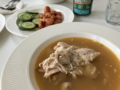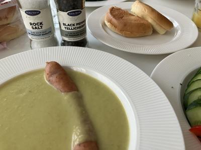 4日目の朝食です。Coopブランドのブロッコリー・スープを温め、それに...