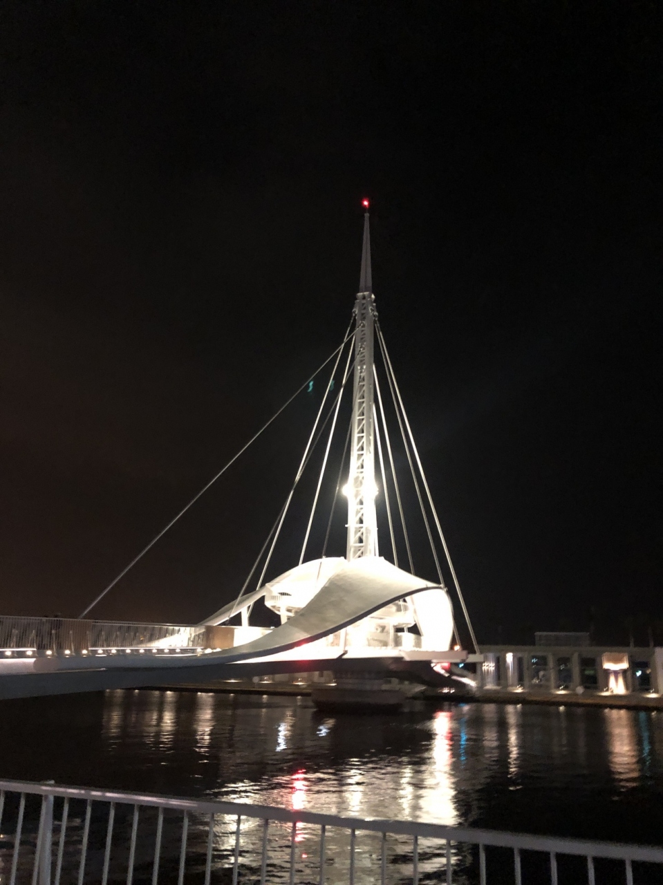 もともとあった駁二藝術特區に新しくできた白い橋で、ちゃんと旋回するように設計されています。大義街という通りの突き当たりにありました。LRTの駅だと、駁二大義駅が一番近いです。台湾で初めてつくられた旋回する橋なので、かなり気合が入ってました