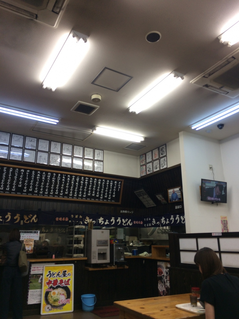 一番街のアーケードのところにあるきっちょううどんで、宮崎のうどんチェーン店でした。4人で座れるテーブルがいくつもあり、店内はテレビもついていました。おにぎりもテイクアウトができ、サラリーマンがテイクアウトしていました。